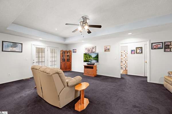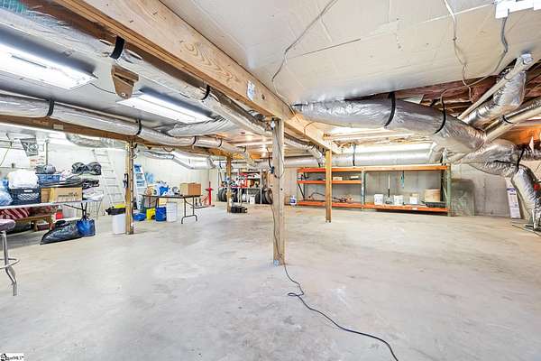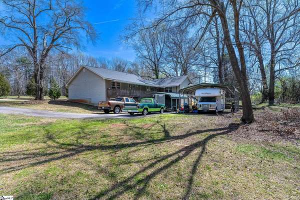 Welcome to this spacious 3-bedroom, 2-bath ranch home situated on approximately 2.5 acres in northern Greenville County. With over 2,300 square feet of living space and a full unfinished basement, this property offers both comfort and incredible potential. The home features an open floor plan with large living areas, including a living room and great room with gas log fireplace, creating the perfect space for gathering and entertaining. A dedicated office with built-in bookshelves near the entry provides an ideal work-from-home setup. The split-bedroom layout offers privacy, with two generously sized secondary bedrooms on one side of the home and a spacious primary suite on the opposite side. The primary bedroom easily accommodates a king-sized bed and includes a sitting area, walk-in closet, and an en-suite bath with separate shower and garden tub. Enjoy both formal dining and a breakfast area, providing flexible space for everyday living and entertaining. Step outside to the large wrap-around porch, covered back porch, deck, and patio, perfect for relaxing or hosting outdoor gatherings. The full unfinished basement, accessible from the exterior, provides abundant space for a workshop, storage, or future expansion. Car enthusiasts, hobbyists, or those needing extra storage will appreciate the multiple garage spaces and ample parking. The expansive 2.5-acre lot offers a blend of open space and wooded areas with plenty of room for a pool, barn, detached garage, or outdoor recreation. This property offers the peace of country living while still being conveniently located near Greer and surrounding amenities.
