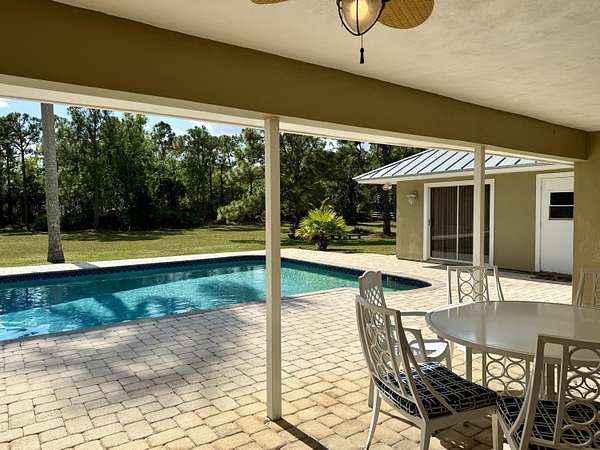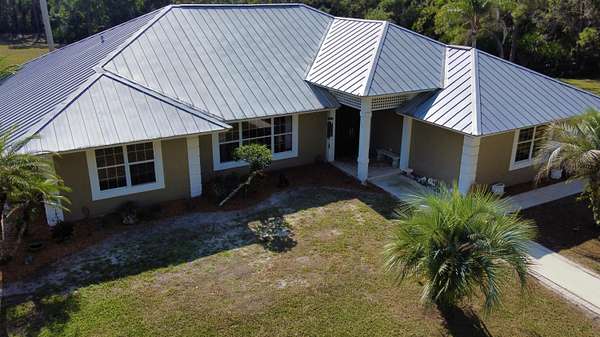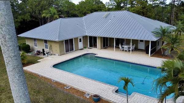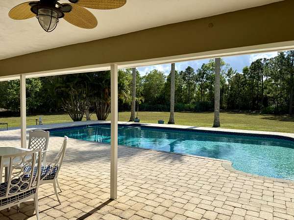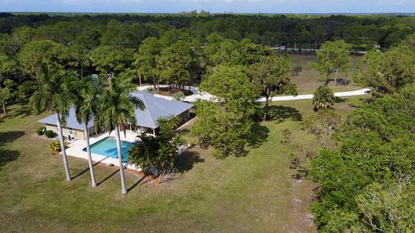 Original owner/builder of this superbly built home on 6.79 high & dry Acres in Jupiter ensured that EVERYTHING was done to the highest caliber of construction. Impeccably maintained this home has 4 Bedrooms PLUS Office 2.5 Bathrooms 3 Car Garage, 20'x40' POOL, standing seam METAL roof, complete storm protection, high vaulted ceilings, impact skylights, cabana bathrooms. An exceptional floor plan & thoughtful placement of glass doors & windows provides your own private views of nature from almost every room in the house. Open to the family room a very functional kitchen with more than enough space, separate living room & dining room for a bit of privacy, split bedroom floor plan, inviting entrance & circular concrete driveway. Located in the exclusive Gated community of Ranch Colony.