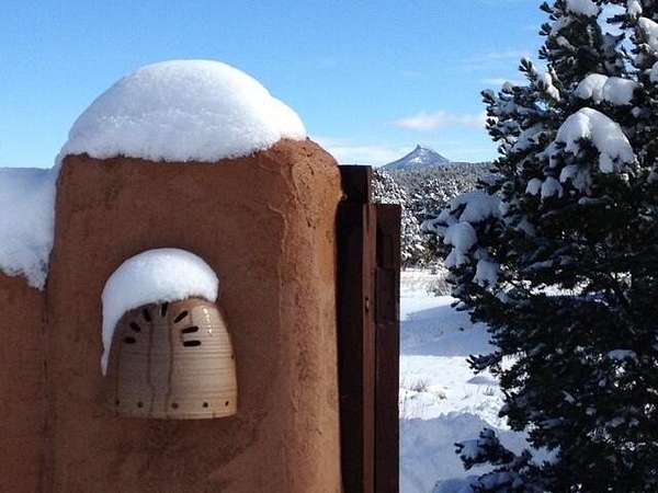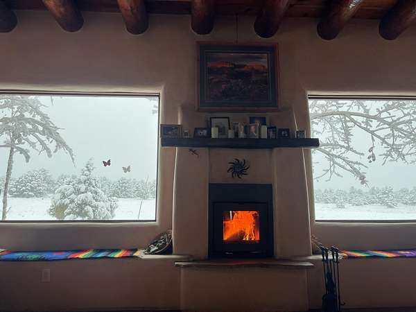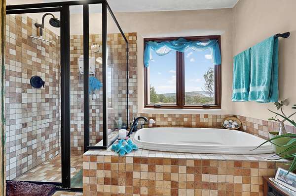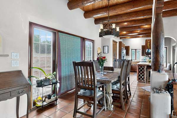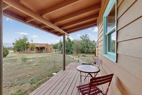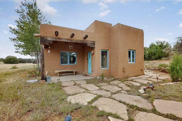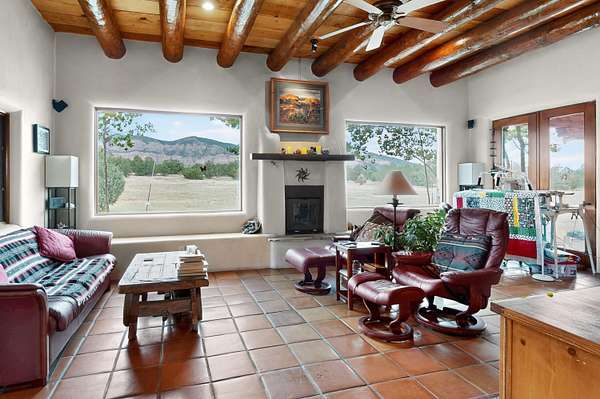 '' If you yearn for privacy surrounded by natural beauty, this is the place you have been searching for. This home, known as ''Casa Alegre,'' the Happy House, and the nearby guest house offer quality custom construction with expansive views from every room including the guest house deck, the entrance portal (porch) of the main house as well as the two large picture windows in the great room of the main house. The traditional Pueblo Revival Style of this home, features bancos that beckon you to sit and appreciate the enchanting everchanging views to be experienced and appreciated at any moment in the day throughout the year. Look beyond the open meadow to the timeless, dramatic Mesa, with its varied hues of strata that provide clues to the geologic history of this land.