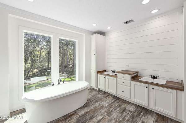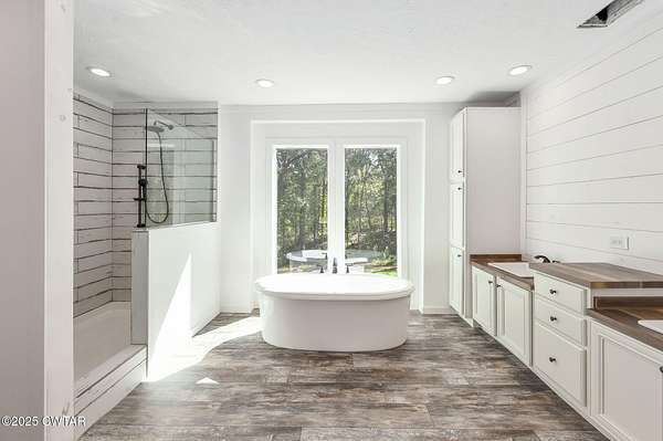 - Ceiling Fan(s), Coffered Ceiling(s), Double Vanity, Fiber Glass Shower, High Ceilings, Kitchen Island, Laminate Counters, Open Floorplan, Pantry, Soaking Tub, Tub Shower Combo, Vaulted Ceiling(s), Walk-In Closet(s)