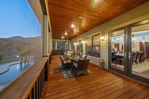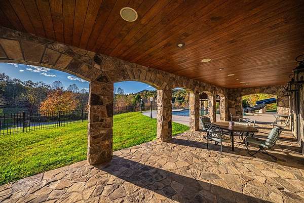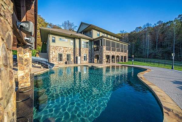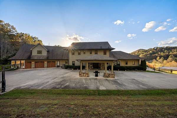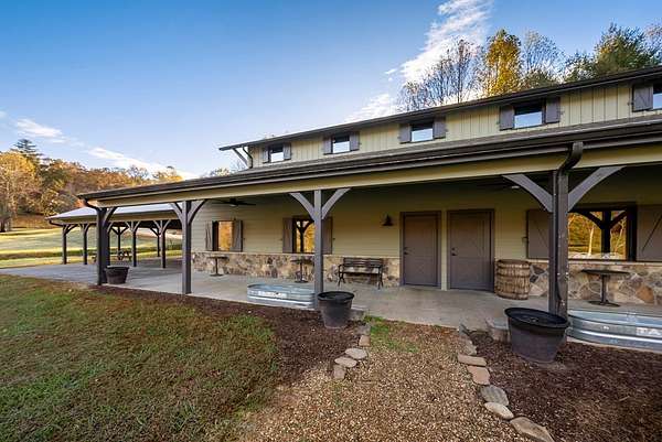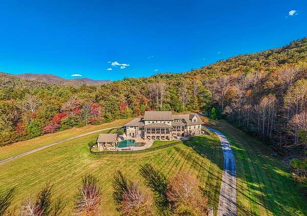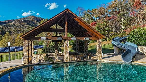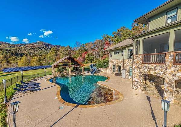 Escape to mountain luxury at Tessentee Farm. This breathtaking property is a truly unique opportunity. Sitting on over 83 acres of land, this home has everything you can dream of. The main level is where you'll find the spacious primary bedroom and ensuite including a jetted tub and walk-in shower. On the main level you will also find the kitchen and living area, along with a screened in porch to take in the gorgeous mountain views. The second level is complete with 4 bedrooms with ensuites and a bonus room for storage or additional living space. The lower level is where you'll find the entertainment area, along with a second full kitchen. Also on the lower level are 2 more bedrooms and 2 more bonus rooms. Stepping outside you'll find the large heated swimming pool equipped with a water slide and a covered bar area connected to it. Making your way down the driveway you'll find the large, heated/cooled barn, perfect for hosting events and gatherings. 3 guest cabins are found across the street for family and visitors. Paved roads and a gated entrance add to the list of amenities this property has to offer. Check out commercial listing for information on the Wedding and Event Center!