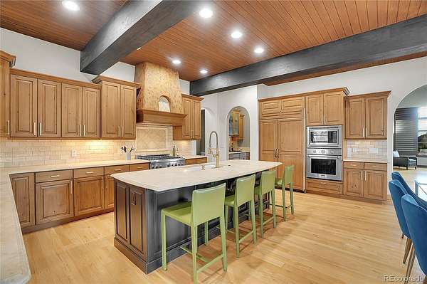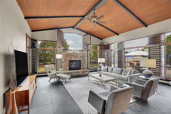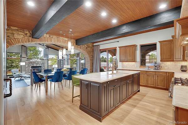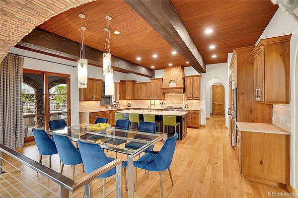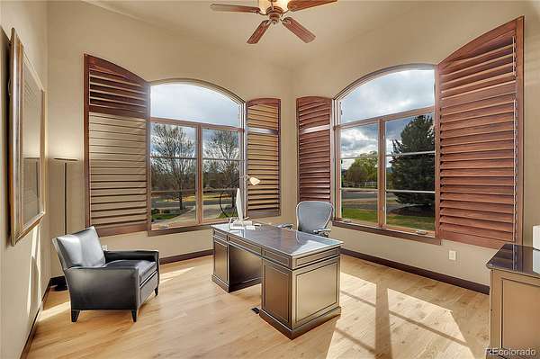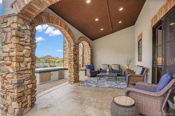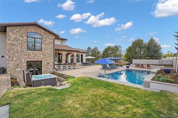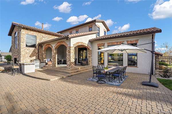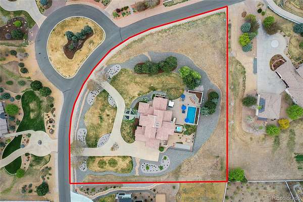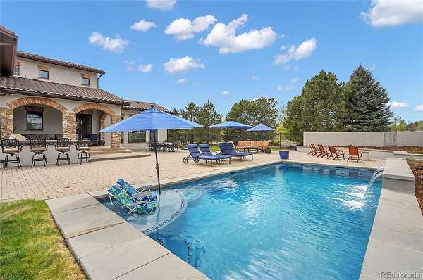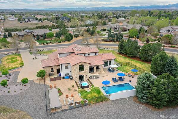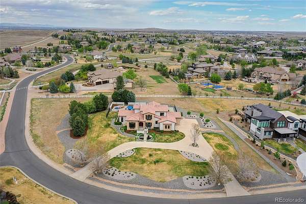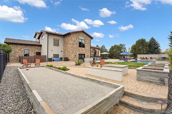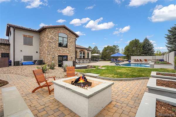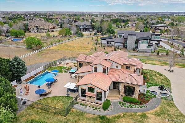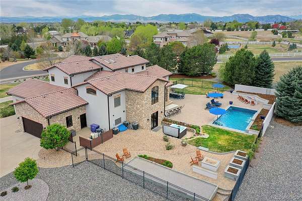 Revel in Luxury! Located in the exclusive Spruce Meadows neighborhood, this remarkable residence sits on nearly two acres of beautifully landscaped grounds, offering privacy, elegance, and a sense of serenity. The home is positioned well back from the street, creating an impressive and refined arrival. You enter into a grand spacious open floor plan designed for seamless movement, with the gourmet kitchen serving as the heart of the home. It’s ideal for both daily living and sophisticated entertainment. Outdoors, the estate feels like a private resort, boasting a sprawling backyard retreat with a covered patio, resort-like pool, modern glass fireplace, bocce ball court, wood-burning fireplace, and a fully-equipped outdoor kitchen with a built-in grill, refrigerator, and a large granite island—perfect for year-round entertaining in Colorado.
