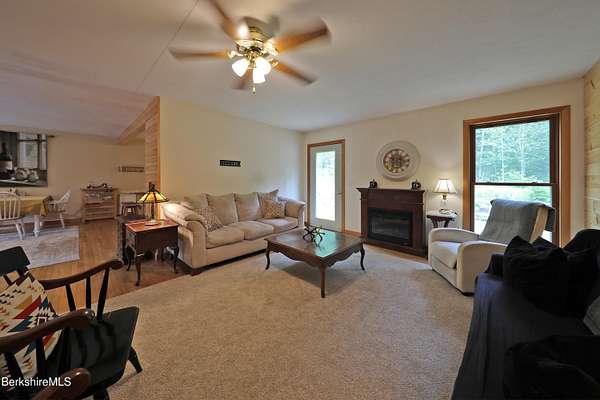 This Contemporary Ranch offers easy living with interesting open common spaces and all three bedrooms and two and a half baths on the main level. The expansive kitchen with European styling, giving you the washer & dryer in this space for convenience. It has wonderful storage, a generous center island that is open to the dining area and the living room. Enjoy the amazing deck with the bonus amenity of a hot tub adding lovely ambiance surrounded by 3 + acres of tranquil nature. This home has an impressive 4 bay garage, 1 leads into a large workshop, 3 additional bays for winter parking or vintage car storage. A large open basement that is partially finished contributes to the open space this property offers. The solar panels are owned and working effectively. The location of this home is most convenient to everything the Berkshires has to offer; from outdoor recreational activities including cultural and theatre venues, casual and fine dining, farmer's markets and boutique shopping with easy access to nearby majoring cities.