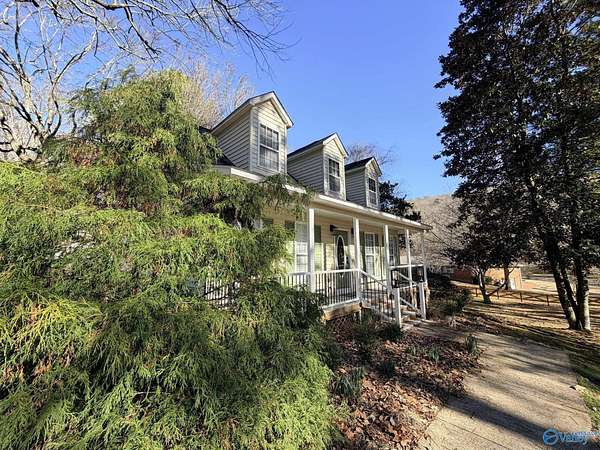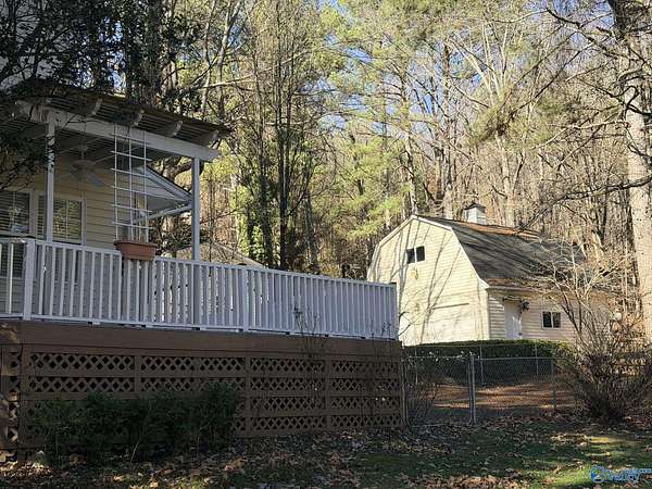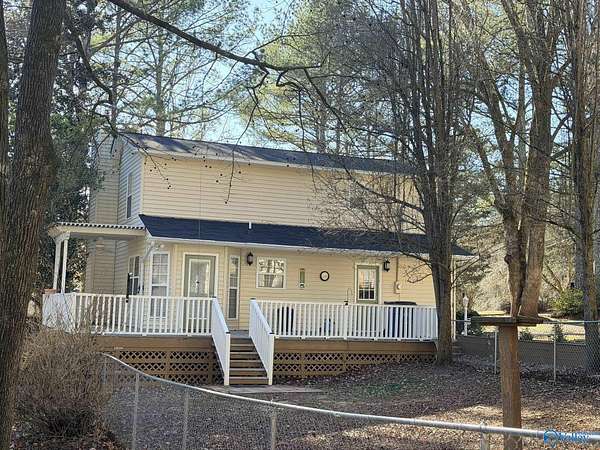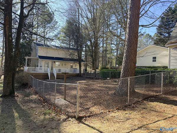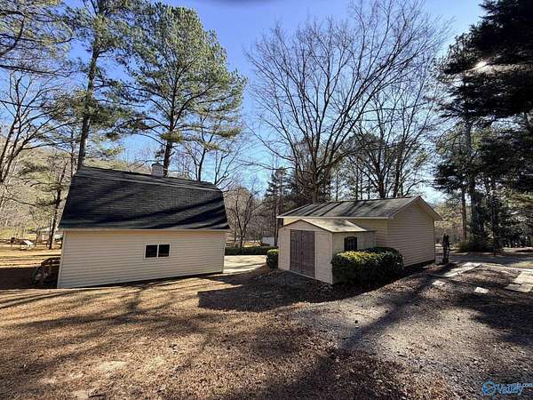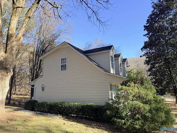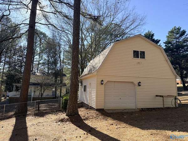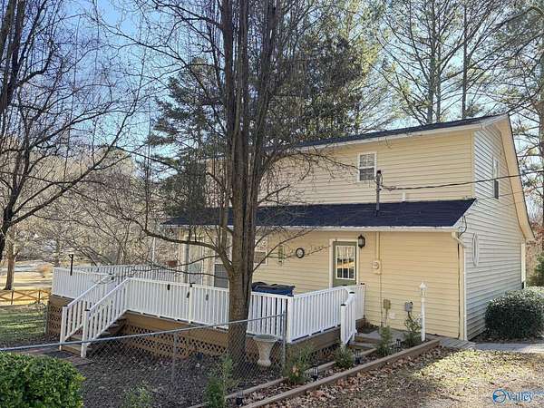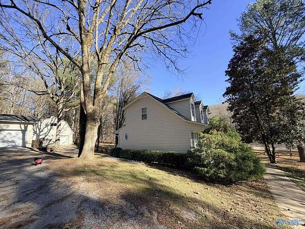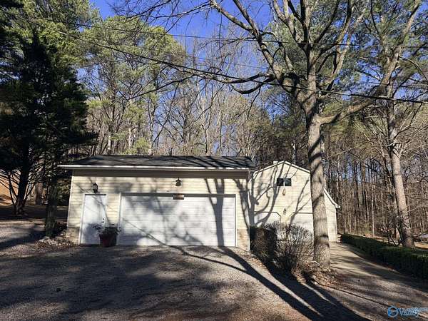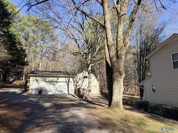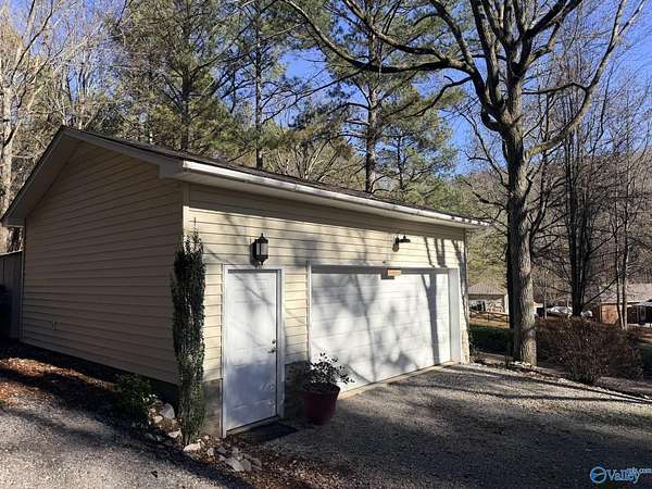 Enjoy the peace and privacy of the established quaint neighborhood with 2+ acres of space while being conveniently located near to Guntersville and 30 minutes to Huntsville. With living on main floor and 2 extra bedrooms and bath upstairs, this home is move in ready with Refrigerator, Dishwasher and stove that is 1 year old. NEW roof on house and 2 detached garages in 2025. Park your cars or have you very own hobby work shop. Garages have propane heat and one garage has a hobby loft. Dedicated laundry room is perfect with outdoor access. Watch the deer and birds feed in your own yard. This gorgeous wooded lot and walkable neighborhood awaits its new owner.