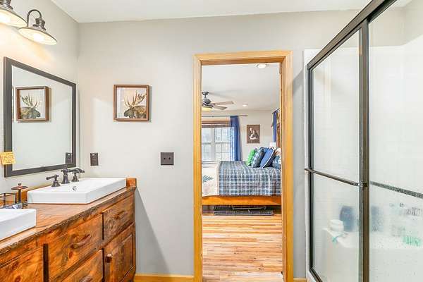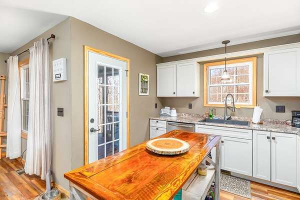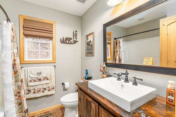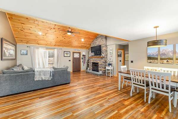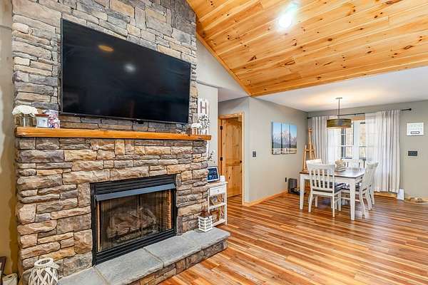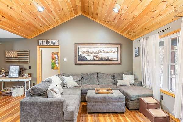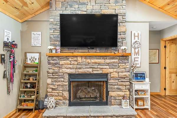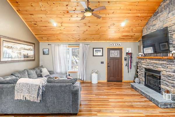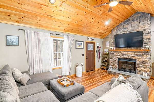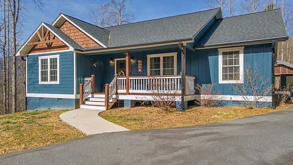 At the end of a quiet paved drive, tucked into 3.69 wooded acres, this newer cabin greets you with layered mountain views that stretch across every season. Mornings begin on the covered porch, coffee in hand, watching the light roll across the ridgelines. Evenings end by the floor-to-ceiling stone fireplace, where the fire's glow reflects off the vaulted tongue-and-groove ceilings and fills the open living space with warmth. Designed for easy, single-level living, the layout feels both open and intimate-ideal for hosting friends after a day on the trails or enjoying a peaceful night in. The primary suite offers its own private bath, creating a comfortable retreat at day's end. Windows frame the landscape, keeping the outdoors ever-present. Though the setting feels worlds away, downtown Sylva is just minutes from your door. A detached carport and EV charging add modern convenience, while hiking, rafting, biking, and the Blue Ridge Parkway are all within easy reach. Here, mountain living unfolds naturally private, effortless, and deeply connected to the beauty of Western North Carolina.