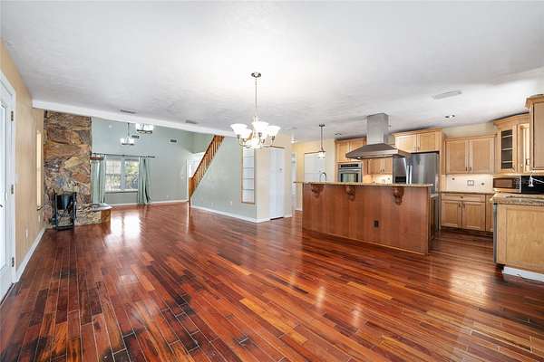 Inside, Brazilian Koa hardwood floors anchor the main level. The living room rises with warmth and volume, centered around a striking wood burning fireplace that creates a natural gathering space. A loft overlooks the living area and offers flexibility for a fourth bedroom conversion, executive office, or secondary living space.