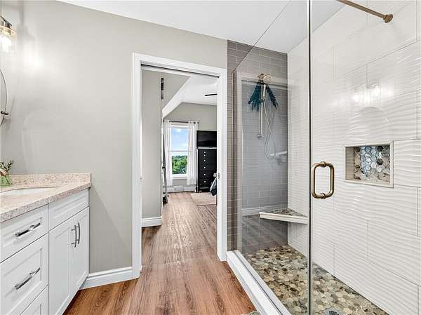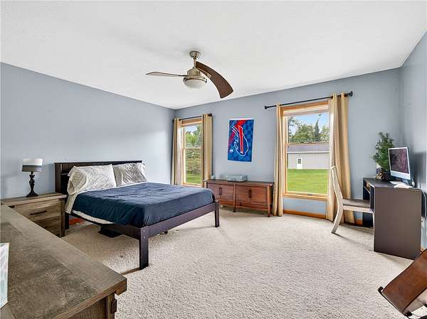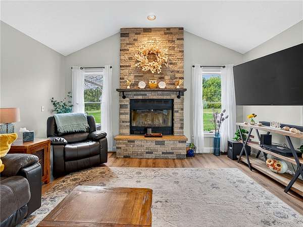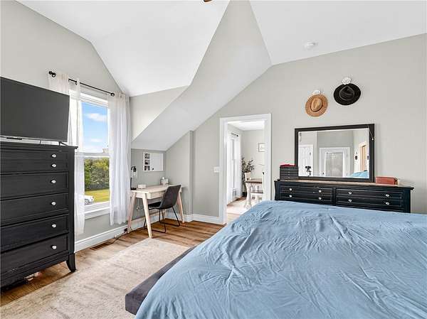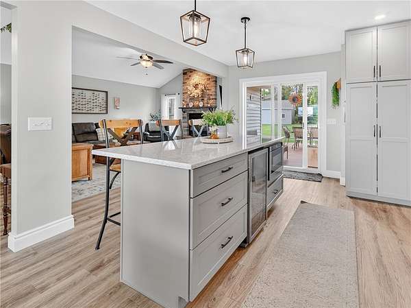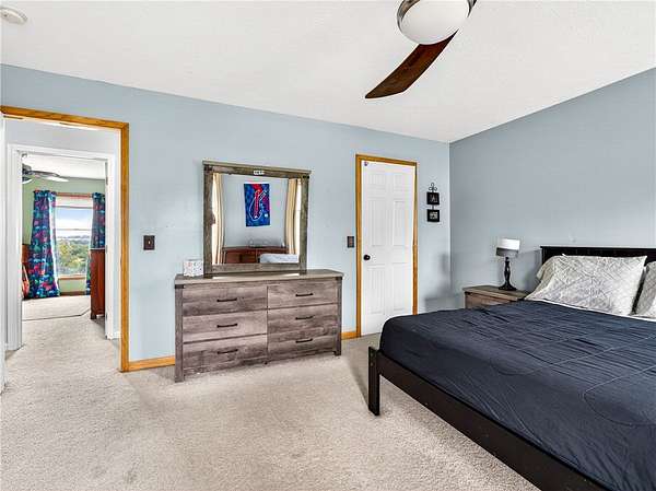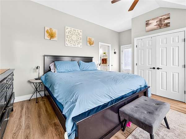 - Bath In Primary Bedroom, Cathedral Ceilings, Ceiling Fans, Convertible Bedroom, Eat In Kitchen, Kitchen Island, Main Level Primary, Natural Woodwork, Pantry, Primary Suite, Programmable Thermostat, Separate Formal Living Room, Solid Surface Counters