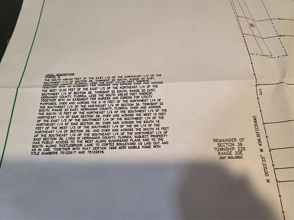 If taking 60 E take 275N exit toward I 4 then take exit 301 for US 98 North towards Brooksville ...Turn onto Thistlebrook Lane and go approx .02 miles then turn right at mailboxes on dirt road directly to end (can't go any further), and you will arrive at 28994 Sugar Sand Place gated entrance. There is another entrance on Sugarsand but not commonly used anymore. Easement off Thistlebrook was granted and documentation is in the attachments.