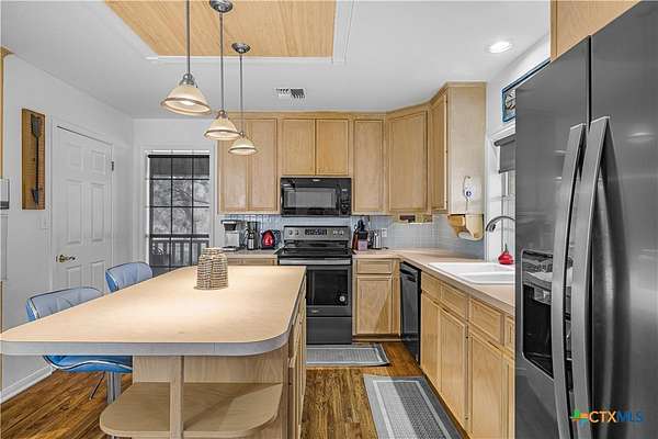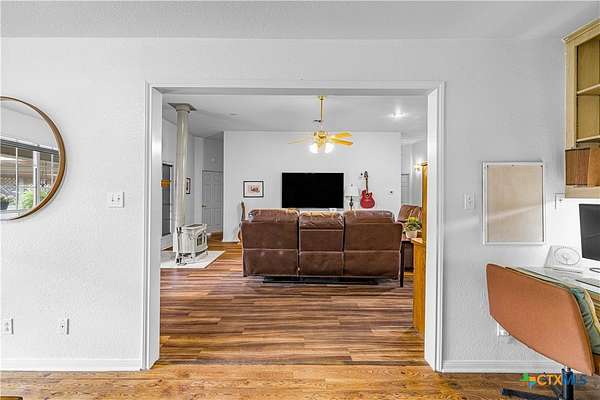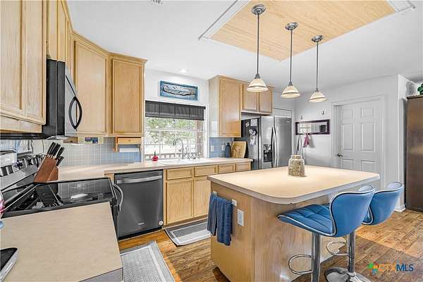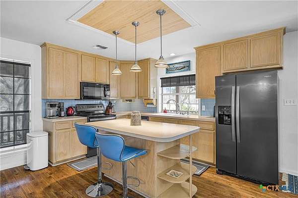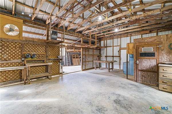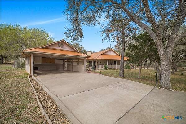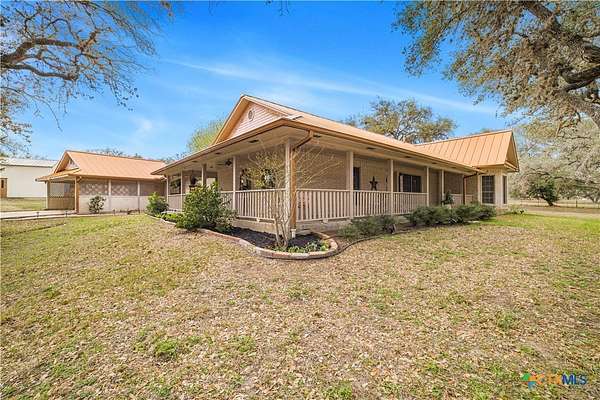 Peaceful country living on nearly 5 oak-shaded acres at the end of a quiet cul-de-sac in Cuero, TX. This thoughtfully updated 3-bed, 2-bath home (2,203 sq ft) features an open-concept kitchen, living room, and dining area with oversized windows, a spa-like master bath with frameless glass walk-in shower, garden tub, and new tile, a kitchen with island bar seating and walk-in pantry, and a split floor plan for privacy. Recent upgrades include a 2024 copper metal roof, remodeled master bath, new vinyl flooring, matching black appliances (2022), and a gas tankless water heater (2023). Private well with water softener; drain field septic; kitchen water purifier. Outside: a wraparound porch with swing, backyard gazebo for watching South Texas sunsets, a 20*30 barn/workshop with built-in workbenches, electricity, and attached lean-to, two-car carport with built-in cabinets, RV hookups with water and electric, greenhouse, and a pond. 45 minutes to Victoria; roughly two hours to San Antonio, Houston, Austin, and the coast.