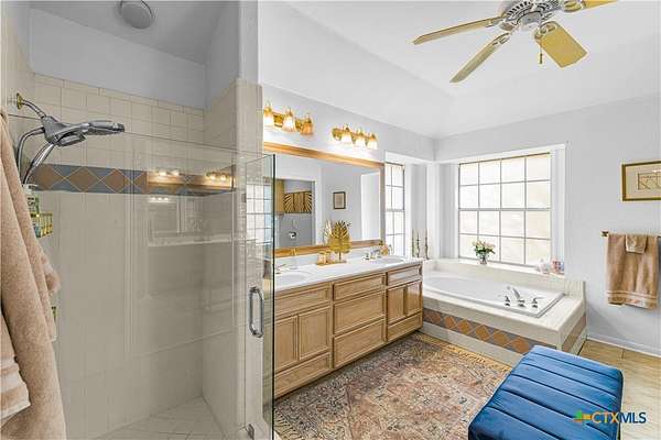 - Breakfast Area, Breakfast Bar, Ceiling Fans, Double Vanity, Garden Tub Roman Tub, Kitchen Family Room Combo, Kitchen Island, Open Floorplan, Pantry, Pull Down Attic Stairs, Recessed Lighting, Separate Shower, Solid Surface Counters, Split Bedrooms, Walk In Closets