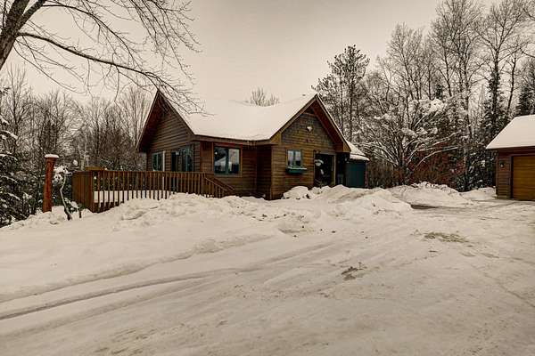 Tucked away in total privacy < five miles from Rhinelander's grocery stores/conveniences, exceptional 2+ bedroom cedar-sided home on the Hat Rapids Flowage offers seclusion with easy access. No visible neighbors, breathtaking sunsets, and wildlife galore-loons, trumpeter swans, deer, bear, turkey, eagles, otters, bobcat, and more-create a true Northwoods retreat. A built-up, dry, drivable road/path leads to the water and dock. Enjoy a new dock (2023), riverside storage for kayaks or ATVs, fenced garden with compost areas, apple trees, berries, and mature perennials. The property features a heated 3-car garage with full bath plus a second 2-car garage. Home offers abundant windows, ash hardwood floors, hickory cabinetry, recessed and under-cabinet lighting, in-floor zoned heat, finished walk-out lower level, generous storage, wide 36" doors, spacious laundry, Spectrum internet, and WPS natural gas/electric with efficient utilities. Peaceful, private, and exceptionally well equipped.