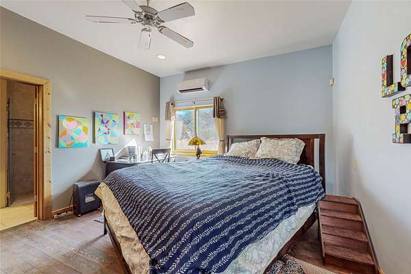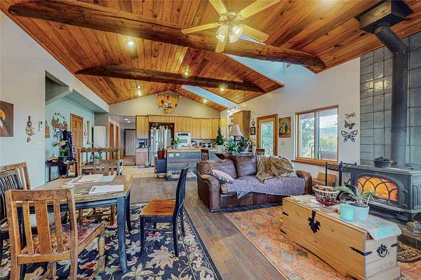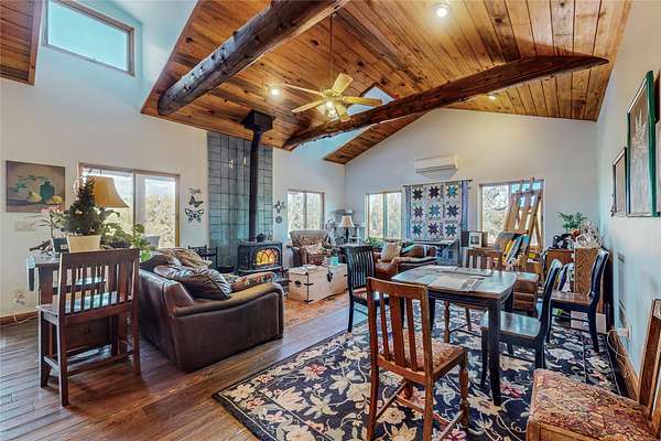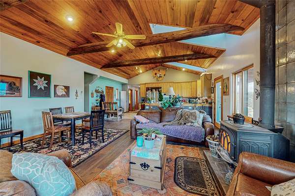 I25 to Exit for State Rd 3. Head south 1 mile. Cross the railroad tracks & in 100 yds take 2nd left (B41-E). Go 1/2 mile to where the road curves to the right and take sharp left at top of the hill onto a dirt road. Stay to the left of the basketball court, through 2 gates for approx 3/4 mile to the property. Gate code needed for first gate. Higher clearance vehicles recommended.