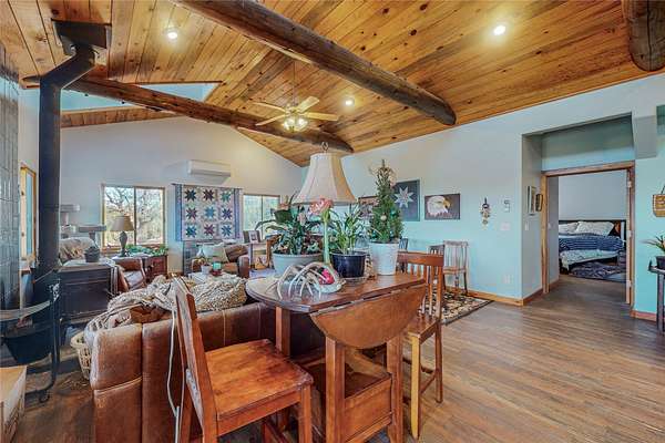 Country living at its best on 39+ acres (2 lots) with rocky outcroppings, a natural spring, open landscape and rich red earth all around. Located just outside the historic village of Ribera down a private dirt road nestles this iconic Northern NM style two story home complete with chicken coop, and a small barn/stable with turn out fencing. Photovoltaic array to help power the house. Inside find an open plan kitchen/living/dining with locally resourced Douglas fir floors, high ceilings, a wood burning stove and access to a portal that runs along the back of the house for shady afternoons enjoying the sweeping views. The second floor consists entirely of a good sized living area (office/studio?) and a separate en-suite bedroom. Mini-split heating and cooling throughout the house. New propanel roof in 2021. Well. Septic. Small fenced side garden. Easy access to Las Vegas, Albuquerque and Santa Fe (40 minutes). Seller may require a 60+ day lease back after closing.