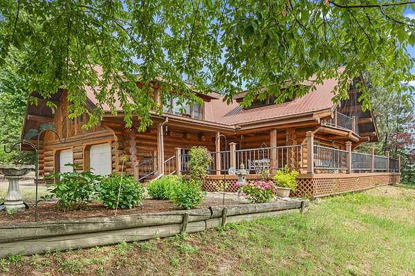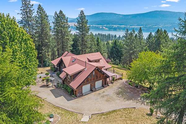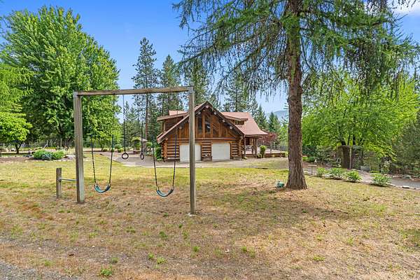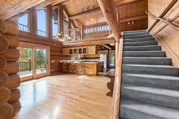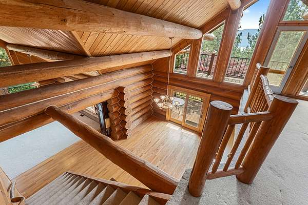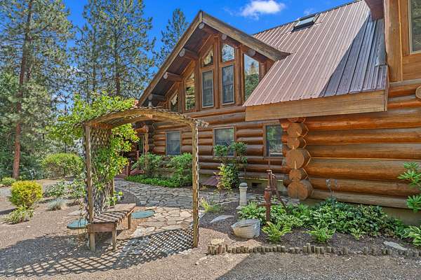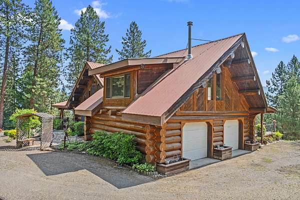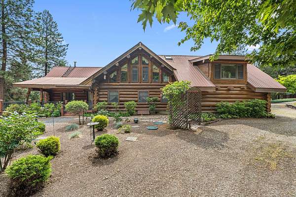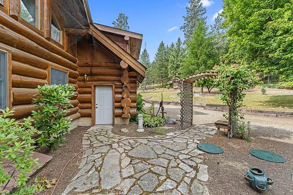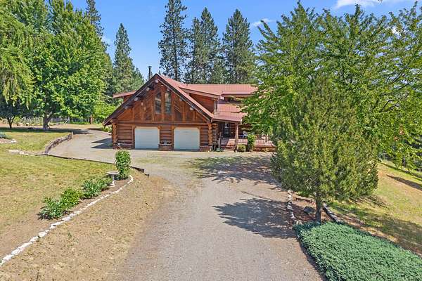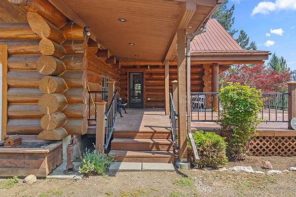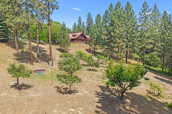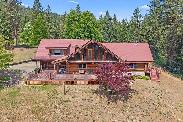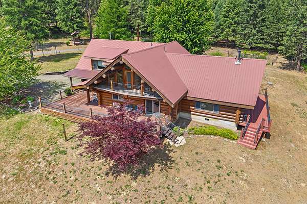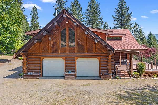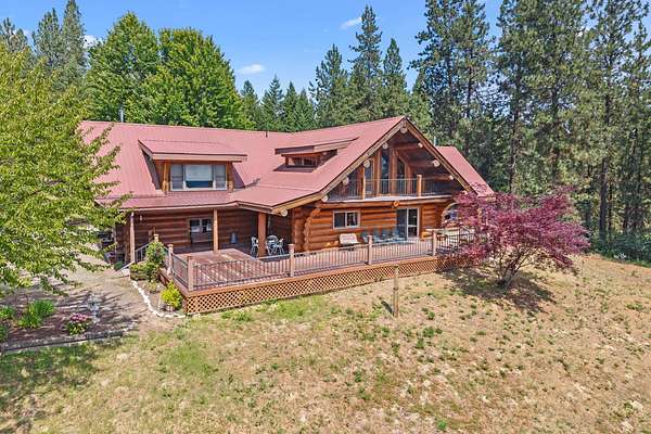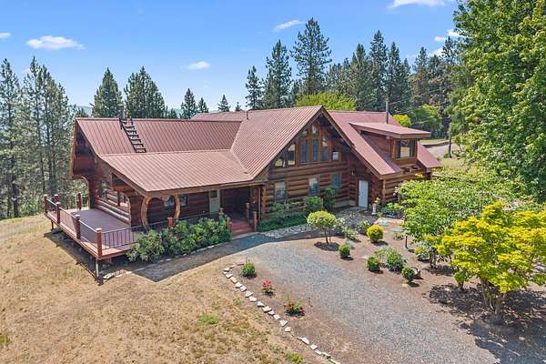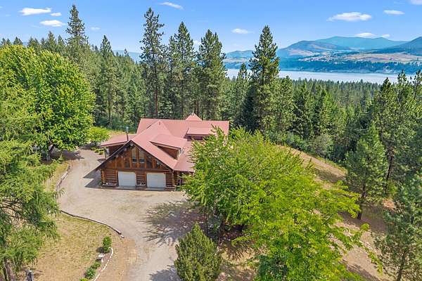 Nestled amidst serene acreage, this beautifully crafted log home offers an unparalleled blend of rustic charm and modern comfort. Upstairs, you'll find an extra-large primary bedroom along with a comfortable family loft area. Downstairs, the third bedroom is oversized and features its own ensuite bathroom. The laundry room offers built-in pantry storage, adding extra convenience. Step outside to experience breathtaking panoramic views of majestic mountains and the sparkling waters of Lake Roosevelt. A spacious deck awaits, ready to give a few minutes of relaxation or is the perfect place to entertain family and friends. A meticulously landscaped yard, a vibrant canvas of mature fruit trees and prolific berry bushes, makes this property ideal for anyone that enjoys the fruits that are