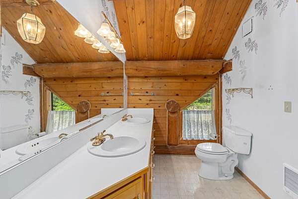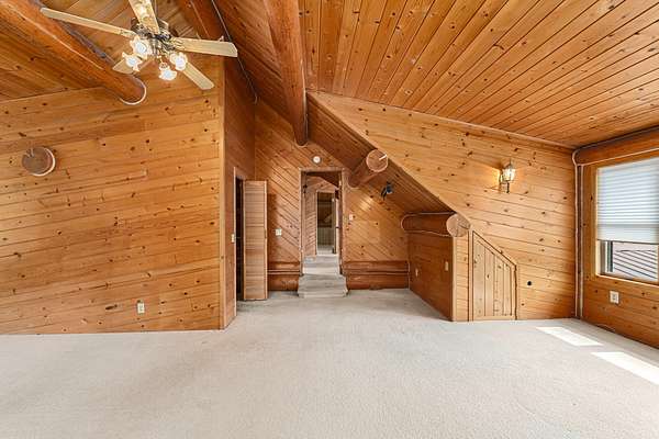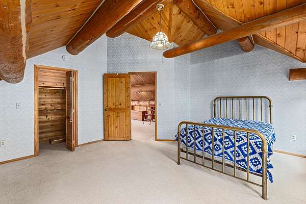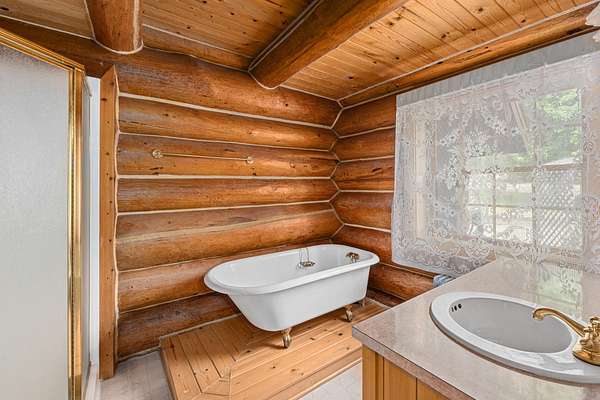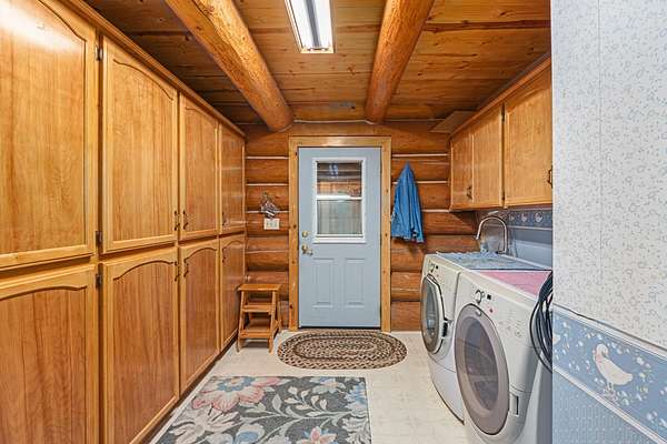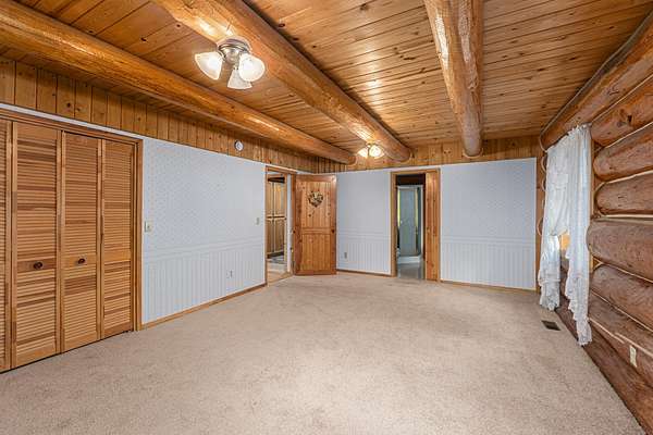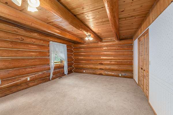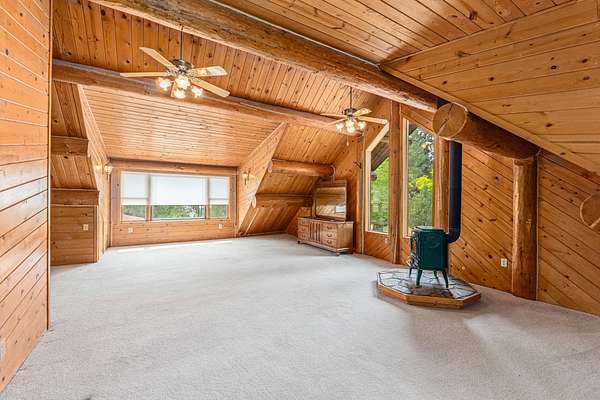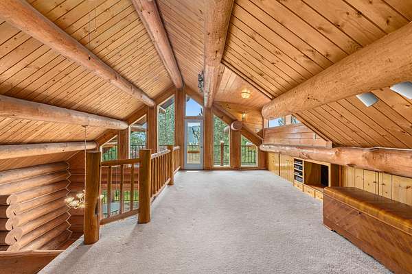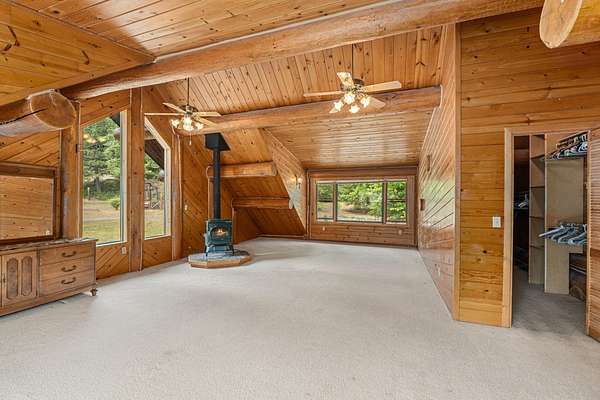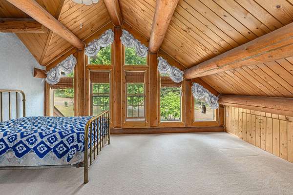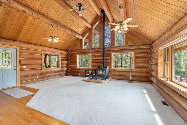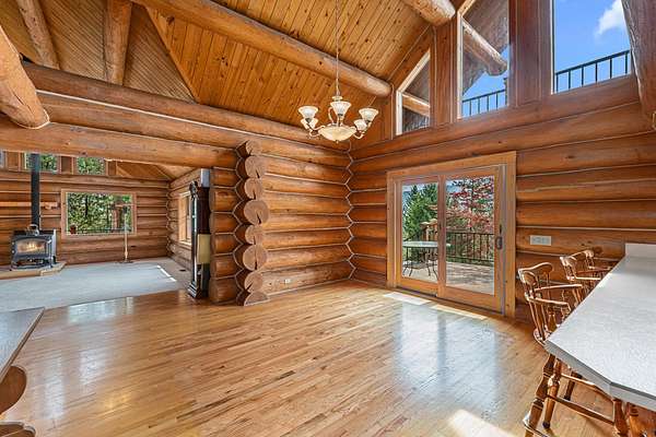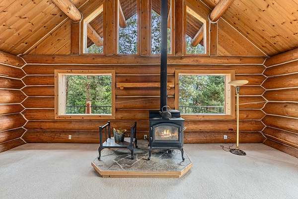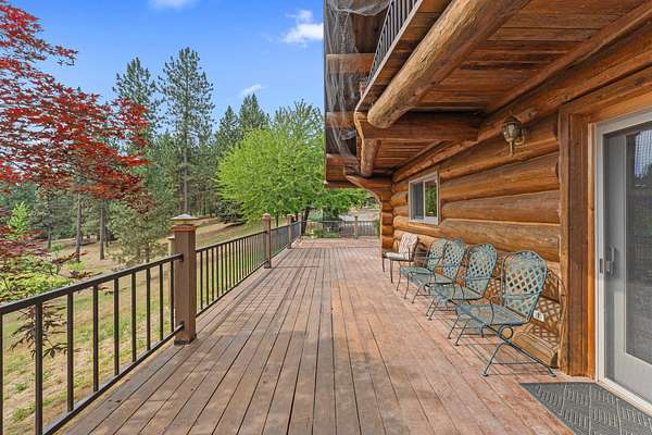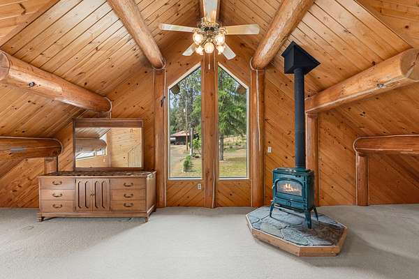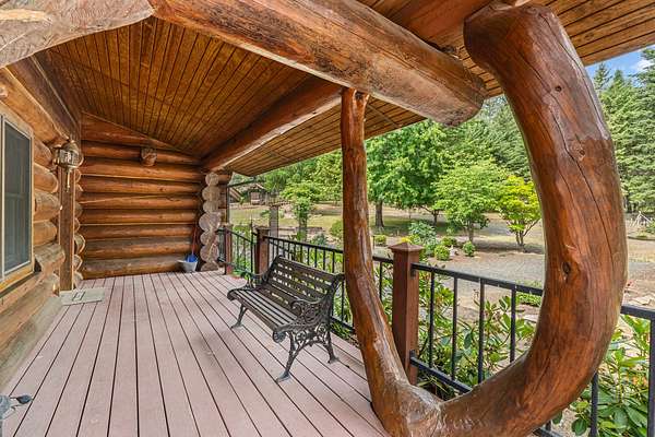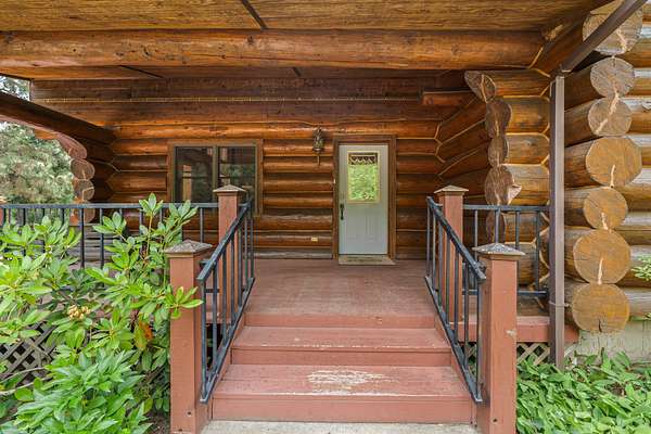 Nestled amidst serene acreage, this beautifully crafted log home offers an unparalleled blend of rustic charm and modern comfort. Upstairs, you'll find an extra-large primary bedroom along with a comfortable family loft area. Downstairs, the third bedroom is oversized and features its own ensuite bathroom. The laundry room offers built-in pantry storage, adding extra convenience. Step outside to experience breathtaking panoramic views of majestic mountains and the sparkling waters of Lake Roosevelt. A spacious deck awaits, ready to give a few minutes of relaxation or is the perfect place to entertain family and friends. A meticulously landscaped yard, a vibrant canvas of mature fruit trees and prolific berry bushes, makes this property ideal for anyone that enjoys the fruits that are