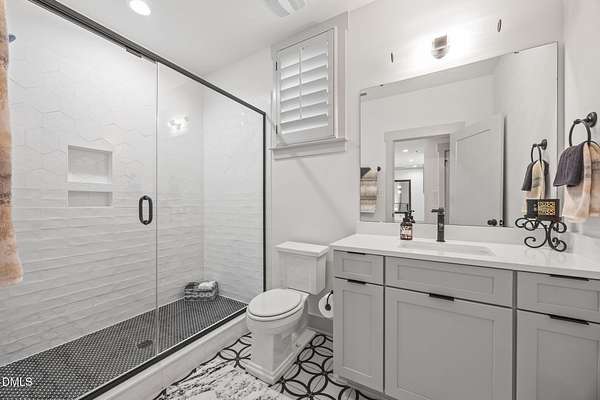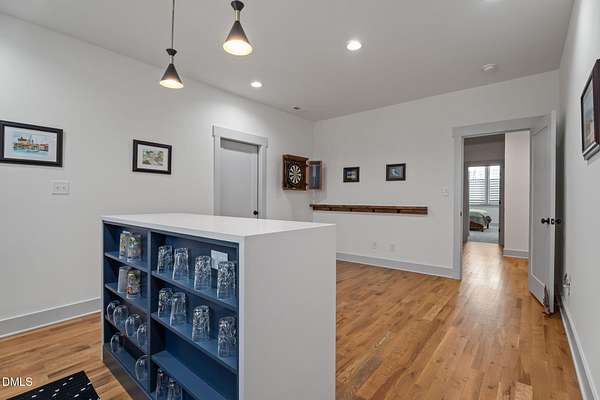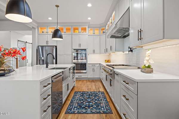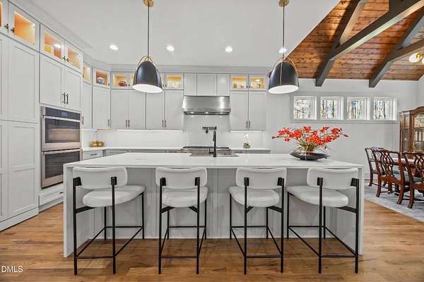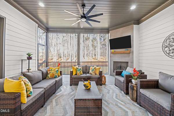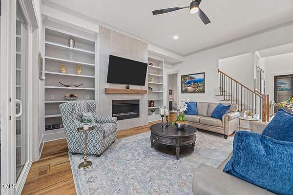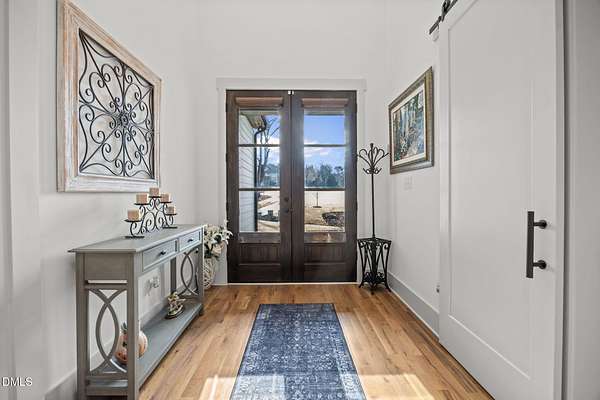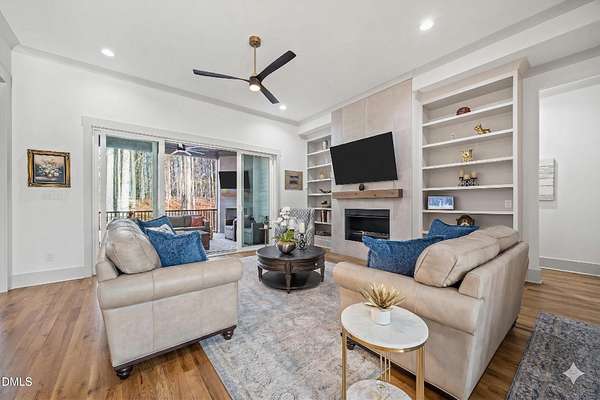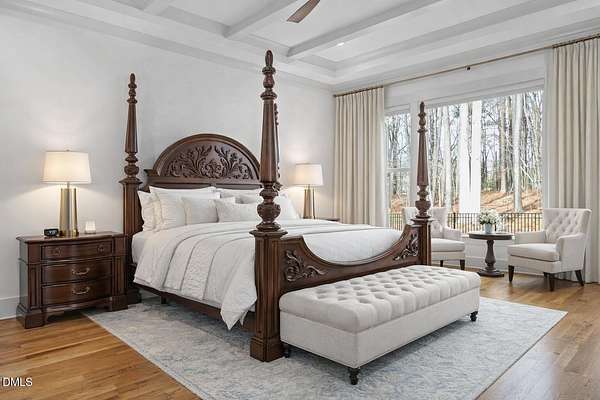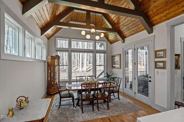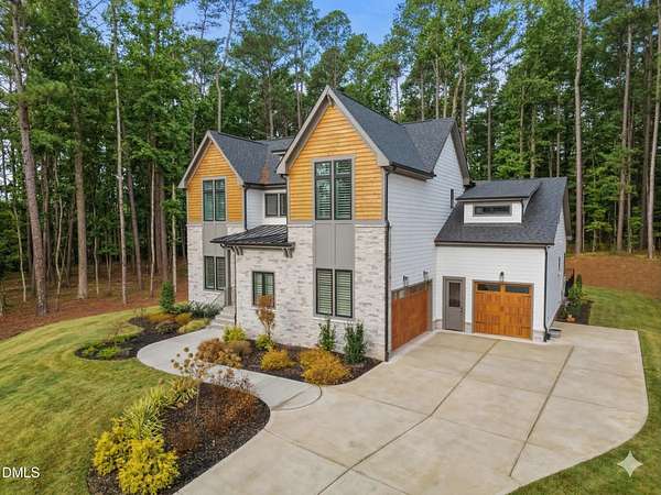 Gold Award Winner - 2023 Parade of Homes! Custom built by Brandywine Homes and beautifully situated on a private 3.82-acre homesite in Hidden Lake, this exceptional property offers stunning lake views and access to incredible community amenities including a clubhouse with veranda, outdoor pavilion, and a fishing pier, Designed for both everyday comfort and entertaining, the home features a desirable layout with first-floor owner's suite and guest suite, site-finished hardwood floors, plantation shutters, electric blinds, and a spacious 3-car garage. The chef's kitchen is a true showpiece, featuring a dramatic ''White Zen'' quartz island with waterfall edge, pendant lighting, chalk-painted cabinetry to the ceiling with upper glass display, designer tile backsplash, and a stainless steel appliance package including a gas range, wall oven, and microwave. A butler's pantry and hidden walk-in pantry with cabinet door entry provide exceptional storage. The kitchen opens seamlessly to a vaulted dining area, creating the perfect setting for everyday living and entertaining. The luxurious owner's retreat features hardwood floors and a tray ceiling with accent beams. The spa-inspired bath includes 24x24 tile flooring, a custom floating vanity with quartz countertops and rectangular sinks, a zero-entry tile shower with frameless glass, and a striking black freestanding soaking tub with floor-mounted filler. The expansive walk-in closet includes a built-in island and direct access to the laundry room. The family room is anchored by a tile-to-ceiling gas log fireplace with open shelving and accent beams, and opens to a screened porch with its own tile-surround outdoor fireplace, perfect for year-round enjoyment. Upstairs features a library, game room, and bourbon bar with built-in wet bar, along with walk-in unfinished storage. Hidden Lake offers a rare combination of privacy and convenience, located just minutes from Downtown Wake Forest with its charming shops, restaurants, and breweries, and approximately 30 minutes to Downtown Raleigh and RDU International Airport. Outdoor enthusiasts will appreciate nearby Falls Lake State Recreation Area, offering boating, fishing, hiking trails, and miles of scenic shoreline. Don't miss out on this rare opportunity! Schedule your private tour today.