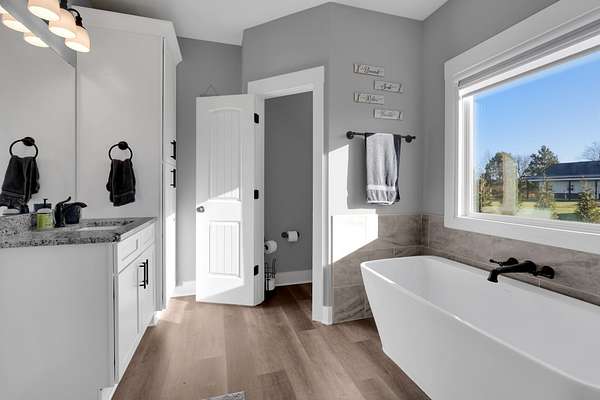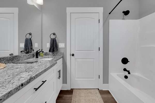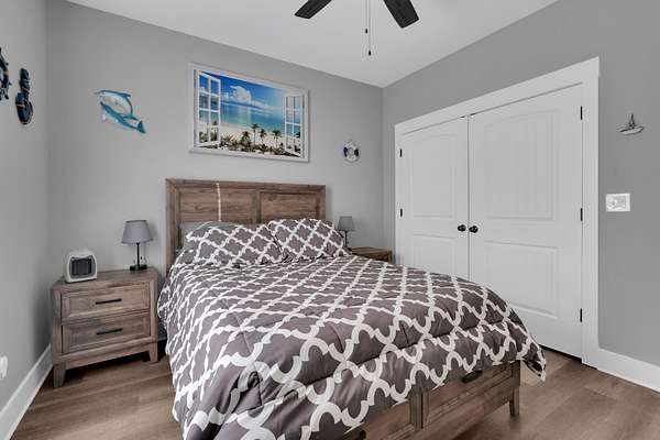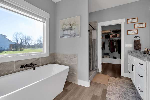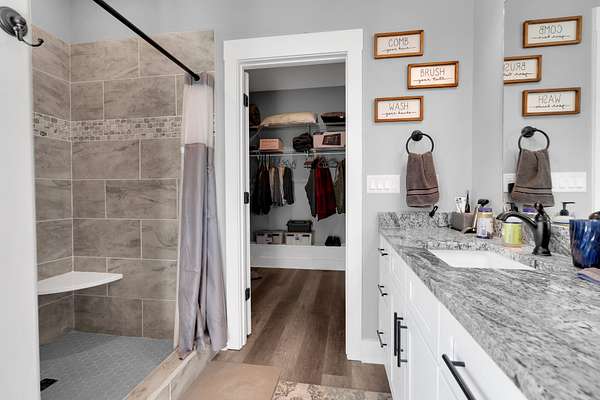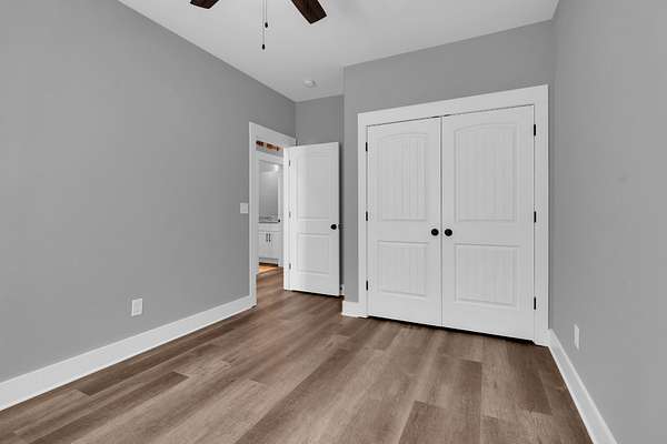 The split-bedroom floorplan offers privacy for the primary suite, while secondary bedrooms are positioned on the opposite side of the home. The primary suite includes a private bath and generous closet space.