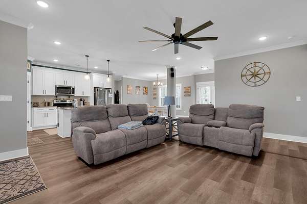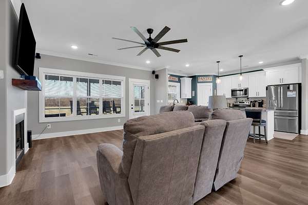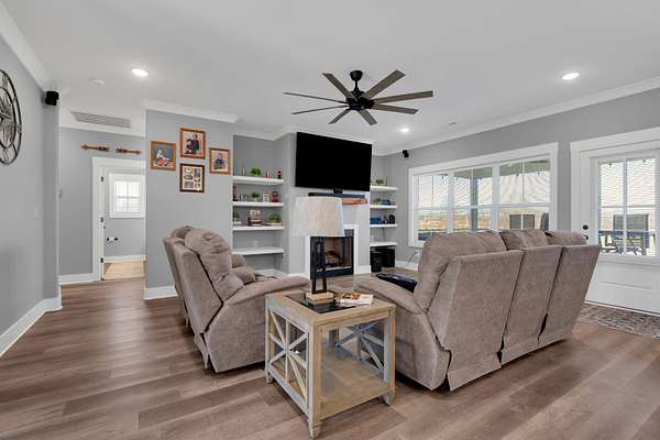 The spacious living room features luxury vinyl plank flooring, crown molding, recessed lighting, and a beautiful fireplace with custom wood mantel and built-in shelving. An oversized ceiling fan and large windows create an inviting, comfortable space for everyday living and entertaining.