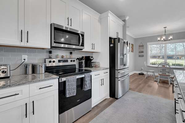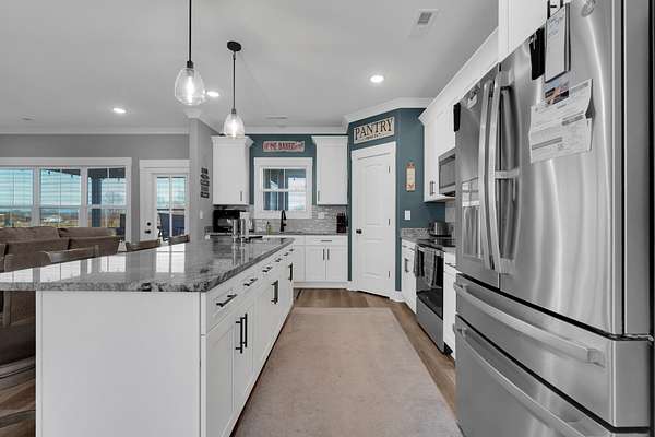 The kitchen is the centerpiece of the home with an oversized granite island, bar seating, white shaker cabinetry, stainless steel appliances, tile backsplash, and pendant lighting. A walk-in pantry provides excellent storage, and the open flow into the living and dining areas makes this home ideal for gatherings.
