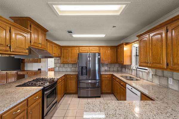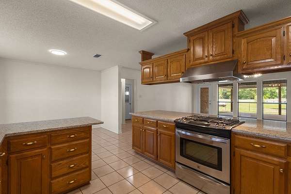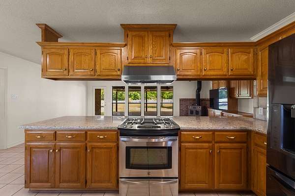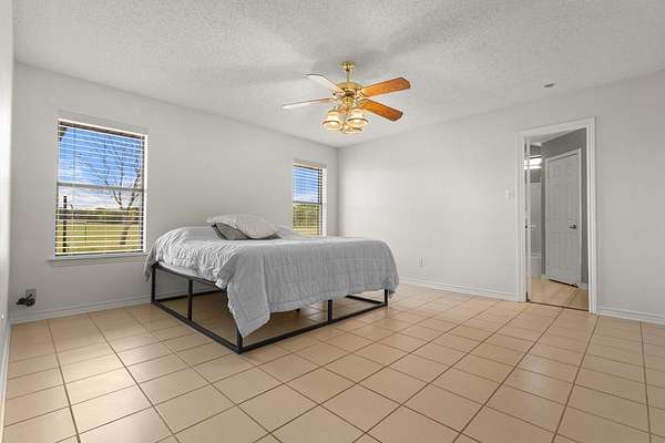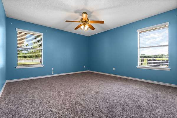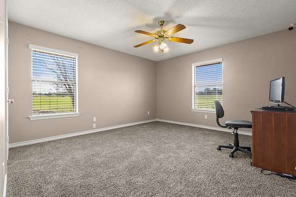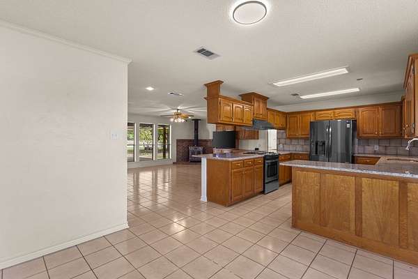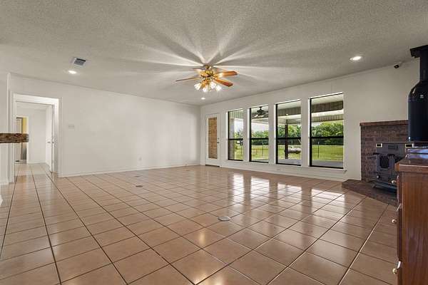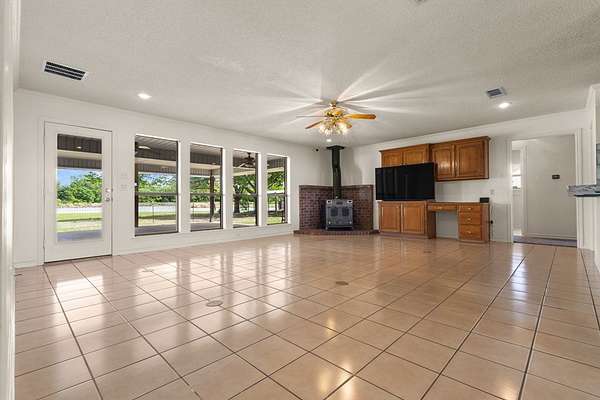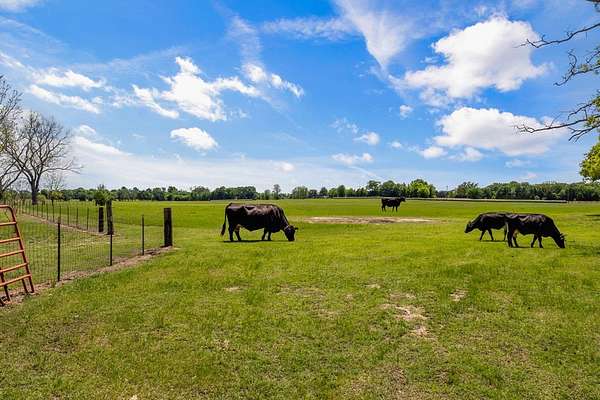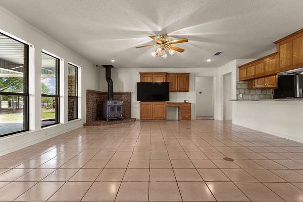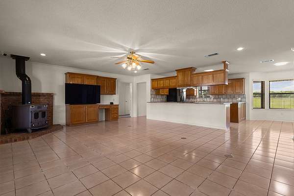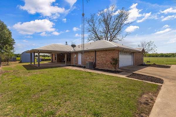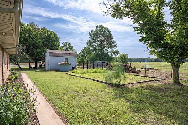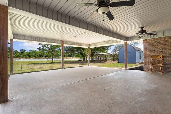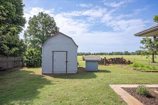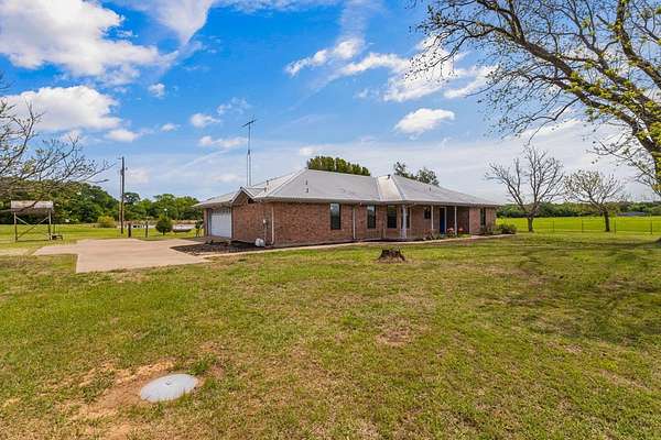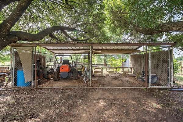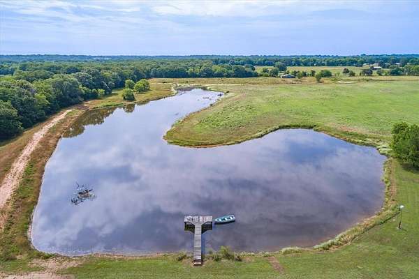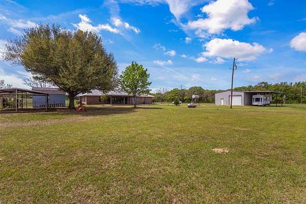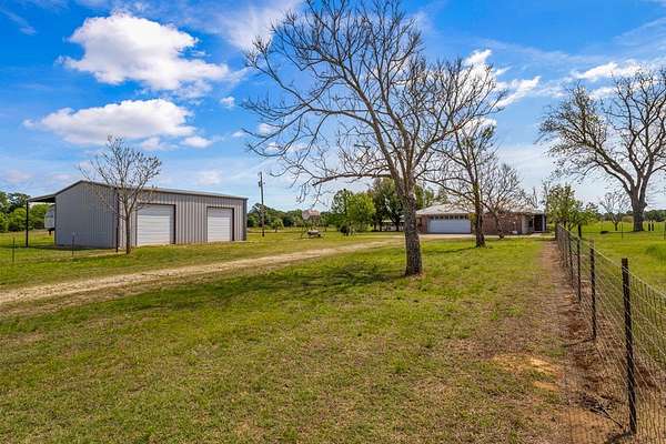 Experience the allure of 21 expansive acres, embodying the quintessential essence of country living. This property boasts meticulously maintained fencing and a picturesque driveway lined with pecan trees, guiding you to your ideal residence. Inside, an open floor plan seamlessly connects the kitchen to a cozy living area, featuring a wood-burning stove with an insert. A wall of windows bathes the space in natural light, revealing a 25x30 covered patio perfect for hosting gatherings or outdoor grilling, all with a captivating lake view. The kitchen is equipped with granite countertops and a spacious sit-up bar, ideal for additional seating and effortless entertaining. Tile flooring enhances the primary bedroom, bath, and living-kitchen area. The primary bedroom offers privacy, being separate from the other bedrooms, and includes separate vanities and closets in the primary bath. Secondary bedrooms feature recently updated carpets, and the hall bath includes a convenient shower. Additionally, there is a half bath adjacent to the laundry area, complemented by a 2-car attached garage. The property is located in an Aquifer District, providing excellent-tasting well water. A 3.59-acre lake, teeming with fish, adorns the pasture and includes a fishing dock, perfect for angling or unwinding after a long day. A substantial 30x40 workshop with electricity and three overhead doors offers easy access, along with an attached covered parking area suitable for your RV, complete with a power source. Additional amenities include a well house with storage, an overhead fuel tank for convenient tractor refueling, and a storage building with a dog kennel or chicken coop. With a gated entry, this exceptional opportunity is not to be missed. Secure it now and make this your forever home. Additional acreage is available.
