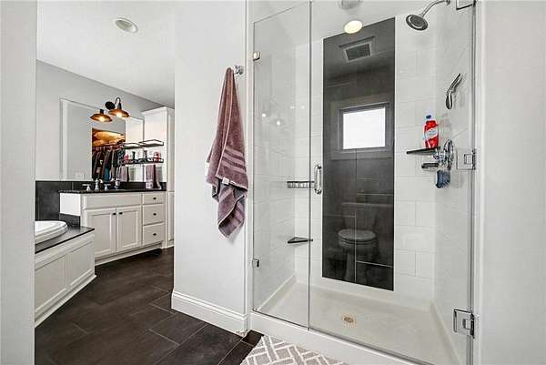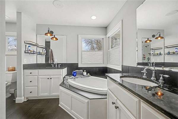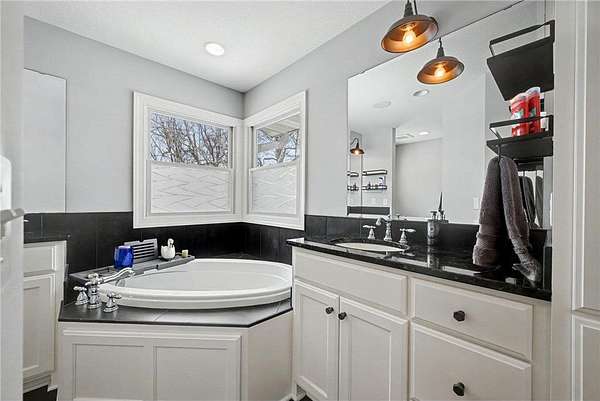 Both main-floor bedrooms feature en-suite bathrooms. The primary suite includes a soaking tub, separate shower, and dual sink areas.