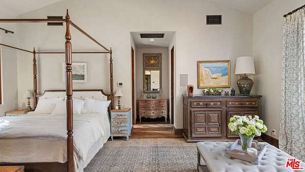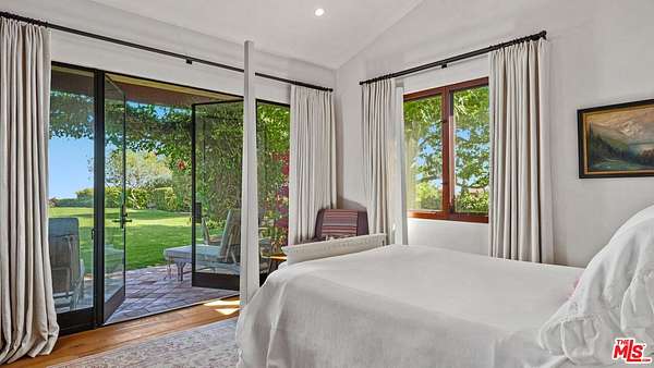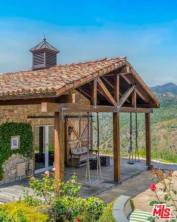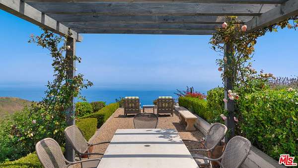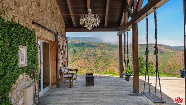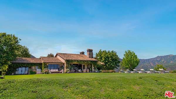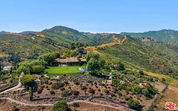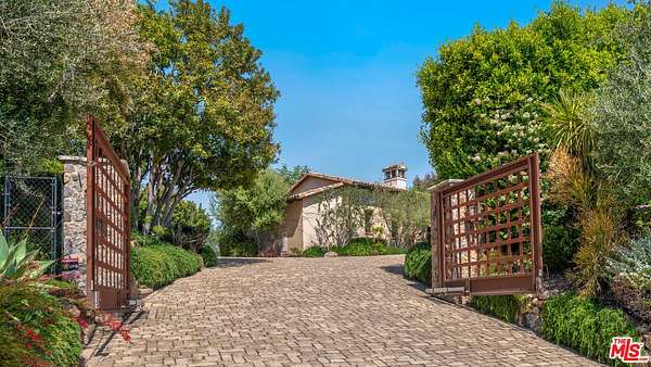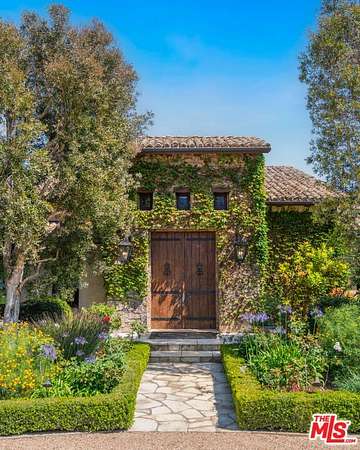 Tucked away behind gates atop the Malibu hills, this enchanting estate captures panoramic ocean and mountain views while evoking the timeless romance of a European countryside retreat. The approach unfolds along a long drive into a broad motor court with parking for 10+ cars, framed by lush gardens and anchored by a stone fountain.Inside, soaring wood-beamed ceilings, French doors, and gallery walls create a backdrop of warmth and elegance. The main living room is crowned by a monumental fireplace and flows to a formal dining room and chef's kitchen, where custom cabinetry, a walk-in pantry, dual ovens, a Viking range, Wolf six-burner cooktop, and a large stone-topped island cater to both intimate evenings and grand entertaining. Nearly every room opens to patios, gardens, or terraces, merging the indoors with the property's dramatic natural setting.The estate is designed with multiple wings for privacy. The primary suite features vaulted ceilings, a stone fireplace, and walls of glass that frame ocean and pool views. Its spa-inspired bath offers dual vanities, a soaking tub, and a large shower with multiple heads. Additional bedroom suites include private patios and marble-clad bathrooms, while a powder room delights with hand-painted lemon grove murals and a sculptural wood vanity. Beyond the main house, a detached office with vaulted ceilings, stone fireplace, reclaimed wood built-ins, and a wet bar creates the perfect studio or guest space. Across the court, a guest suite adjoins the garages, complete with wood floors, vaulted ceilings, en-suite bath, and French doors to a pergola-shaded patio. The outdoor living is extraordinary: a covered loggia with stone fireplace, alfresco dining, and heaters for year-round enjoyment; expansive lawns flowing to a long rectangular pool and spa with automatic cover; and terraced gardens with citrus groves, fountains, koi ponds, and box hedges. Meandering stone paths lead to a barn-inspired guest structure with a porch swing and firepit seating, all overlooking breathtaking ocean and canyon vistas. A professional-grade recording studio with soaring ceilings, custom acoustics, and a sound room enhances the estate's versatility, offering creative refuge for artists and visionaries. Throughout the property, hidden seating areas, romantic pergolas, and layered gardens create a sense of discovery and retreat. Exquisitely landscaped and thoughtfully designed, 2900 Corral Canyon Rd is a rare Malibu estate that combines European elegance, coastal serenity, and boundless possibilities for living, entertaining, and creating.