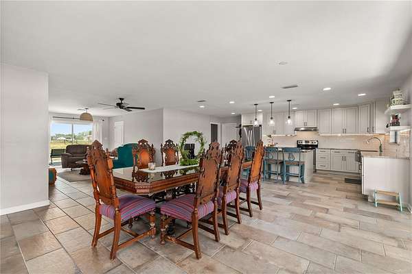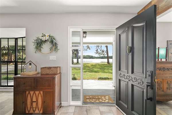 A charming front porch overlooks the water with unobstructed, south-facing views--ideal for savoring both sunrise and sunset across the lake. Inside, the open-concept single-story layout features tile floors throughout the main living areas and carpet in all three bedrooms. A floor-to-ceiling bay window off the kitchen floods the home with natural light and showcases the panoramic lake views, while sliding glass doors lead to a large, fenced backyard designed for seamless indoor-outdoor living.