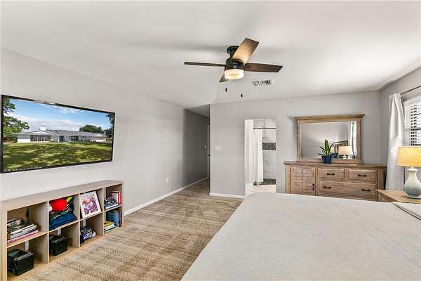 - Ceiling Fans(s), Eat-In Kitchen, Kitchen/Family Room Combo, Living Room/Dining Room Combo, Open Floorplan, Primary Bedroom Main Floor, Solid Wood Cabinets, Split Bedroom, Thermostat, Walk-In Closet(s), Window Treatments