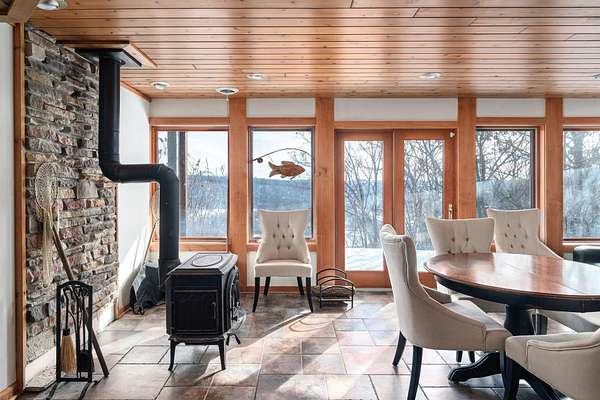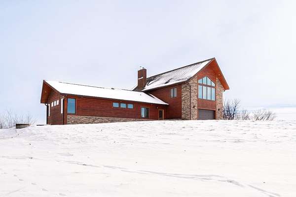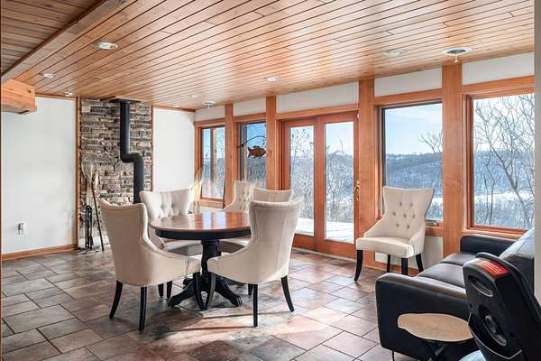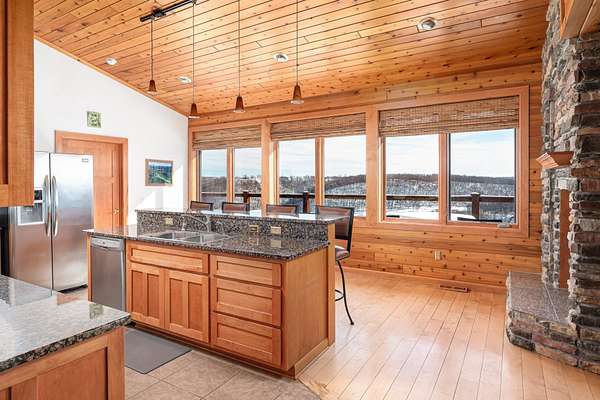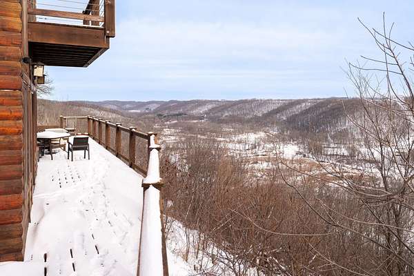 Nestled atop a bluff in the heart of the Driftless, this exceptional Skyview Ln home offers breathtaking, miles-long views over the scenic Kickapoo River Valley. Designed for comfort and luxury, the contemporary home features 3 bedrooms + 3 baths - two spacious main-level suites, one with a gas fireplace and en suite bath, the other offering its own bath and wet bar. An open-concept main level is light filled from expansive windows and has solid maple wood floors, custom cabinetry, granite countertops, and a two-sided wood-burning fireplace connects the living room and eat-in kitchen. A loft with valley view leads to a third bedroom and bath. The lower level has generous entertaining and rec space with walkout. Serene decks, hi-speed internet, and exceptional indoor-outdoor living complete