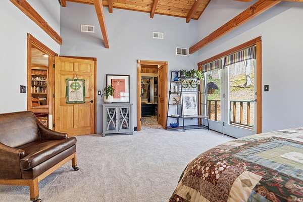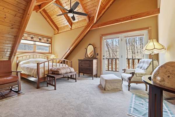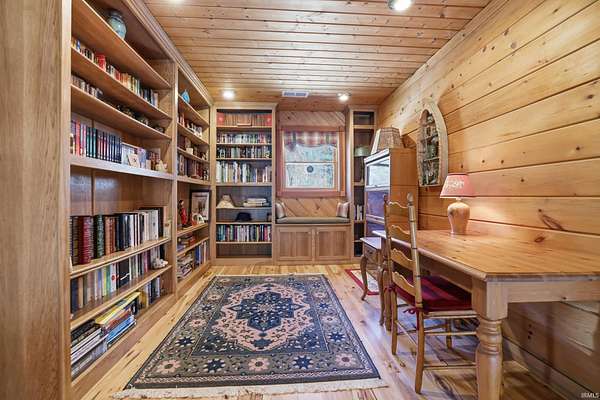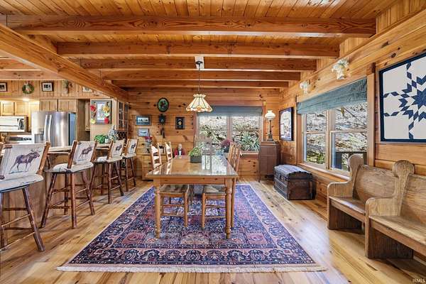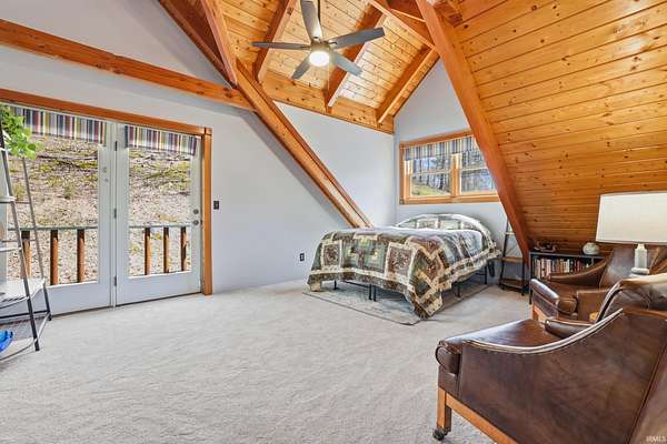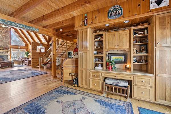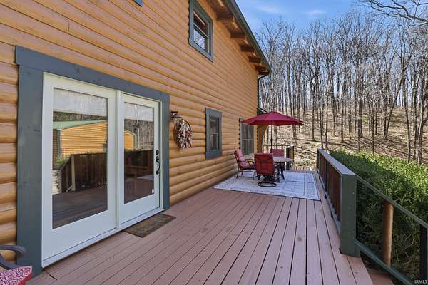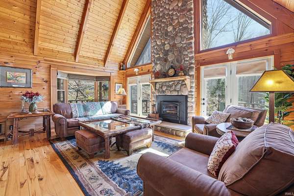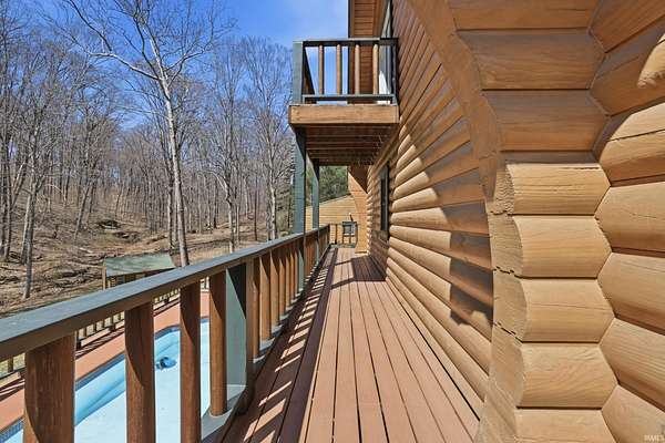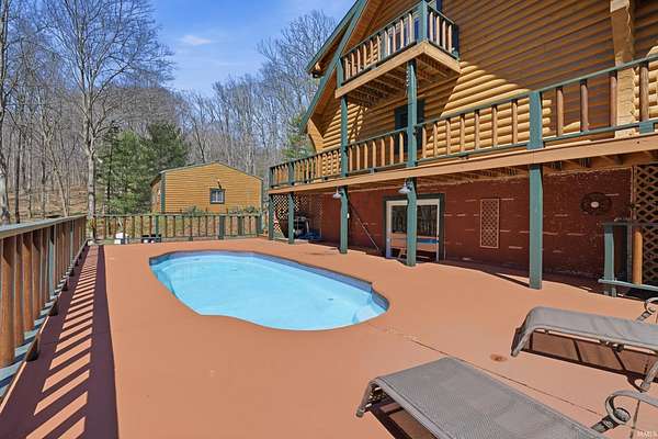 Sprawled across a magnificent nearly 10 acre park-like setting, this meticulously maintained log home offers features galore with over 4200 total square feet, 4 bedrooms, and 3 full baths. The impressive great room provides a grand setting for relaxation and a majestic floor to ceiling stone fireplace offers a focal point for gatherings. The soaring high ceiling, complemented by exposed beams, creates an expansive atmosphere with rustic charm. The main level offers an open floor plan between the great room, well appointed kitchen complemented by the convenience of a kitchen bar, and dining room. Each bedroom offers a serene sanctuary and two upper level suites have their own full bath, walk-in closet, and private balcony offering serene wooded views. Outdoor living is celebrated with a welcoming wrap around and partially covered porch and a spacious deck, perfect for enjoying the surrounding natural beauty. A private pool with heater offers a refreshing escape during warmer days. Expansive outdoor areas abound for outdoor enjoyment under the open sky including a creek with bridges. For entertainment, the lower level offers an immersive viewing experience with built in theater equipment, a bar, exercise area, and it walks out to the pool deck. A detached 2.5 car garage with workshop, a separate pole building, and storage shed provide ample storage. Owners have spared no expense maintaining and updating this property which embodies a distinctive blend of comfort, elegance, and natural splendor and is awaiting its discerning buyer.