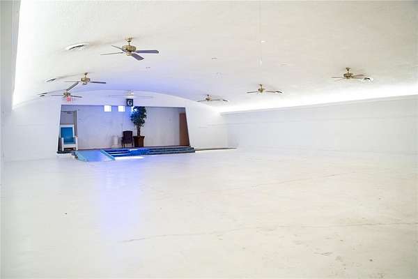 A secondary large gathering room featuring a stage and minimal windows, suitable for performances, presentations, or worship services.