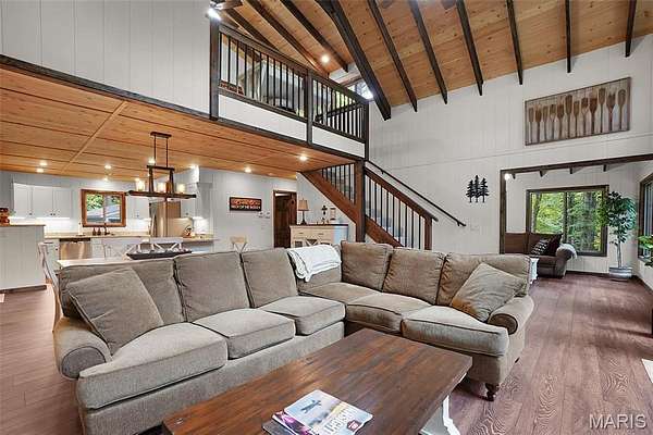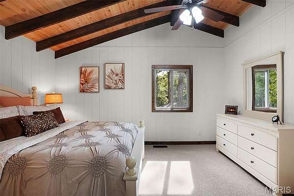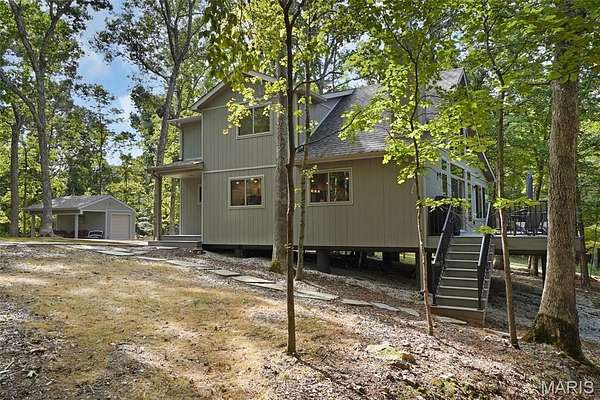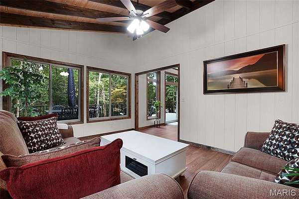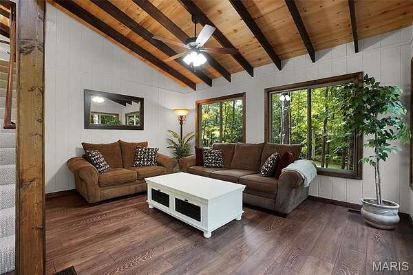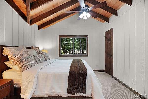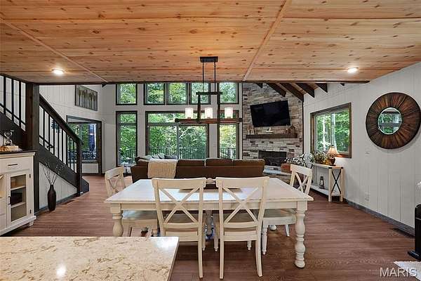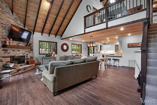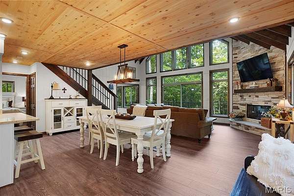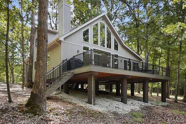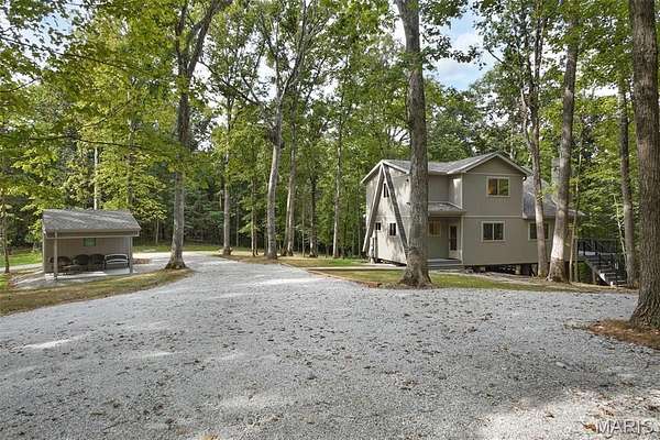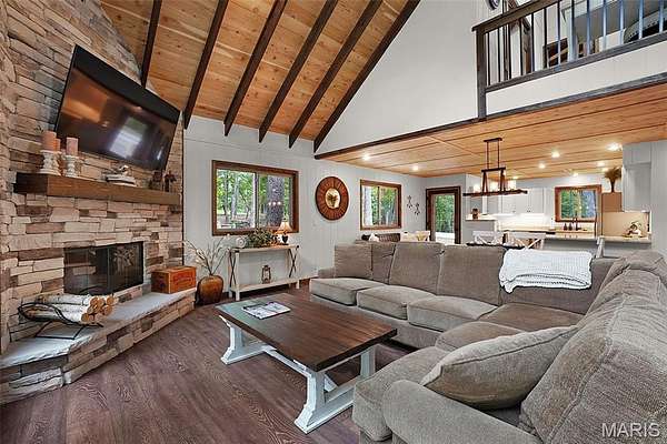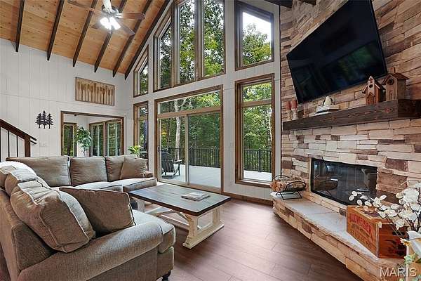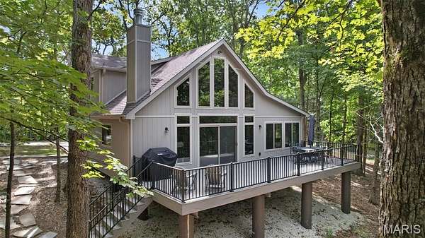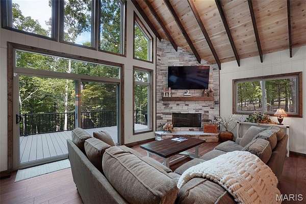 Completed in March 2025, this nearly brand-new chalet features numerous upgrades, including cedar ceilings, quartz countertops, a 12' x 36' expanded composite deck, and a stunning floor-to-ceiling stone wood-burning fireplace. A bright and inviting four-season room adds extra living space year-round. The home sits on a peaceful 2.92-acre wooded lot with just two neighboring properties on a quiet dead-end street, ensuring ultimate privacy. Inside, you'll find straightened walls (no A-frame), a warm and cohesive color palette, and stylish finishes such as metal spindles and baseboards throughout. The professionally landscaped grounds include a fire pit area, stone walkways, and a covered front porch, perfect for outdoor entertaining. The insulated shed features a finished interior and overhead garage door with opener. All new Whirlpool appliances (refrigerator, stove, dishwasher, washer, and dryer) plus a GE microwave/air fryer are included. Just 1/4 mile from Alpine Lake's boat ramp, this home offers access to Innsbrook's exceptional amenities, including over 100 lakes, an 18-hole golf course, hiking trails, fishing, kayaking, tennis courts, a lazy river pool, and more. Whether you're looking for a peaceful retreat surrounded by nature or a profitable short-term rental, this property offers the perfect blend of relaxation and income potential.