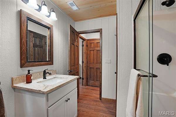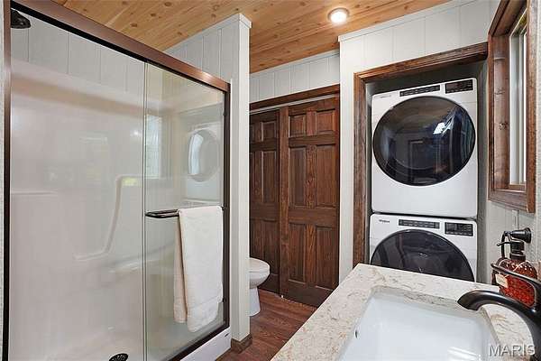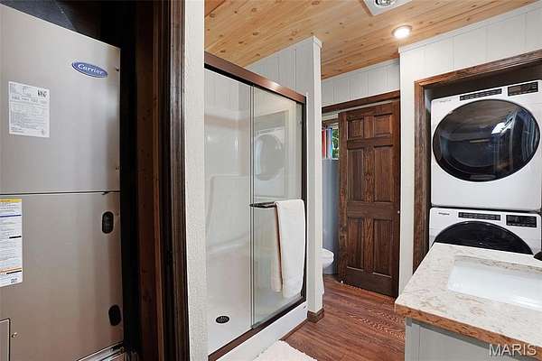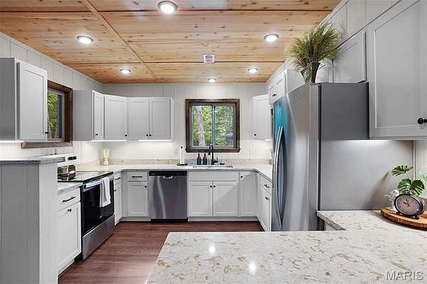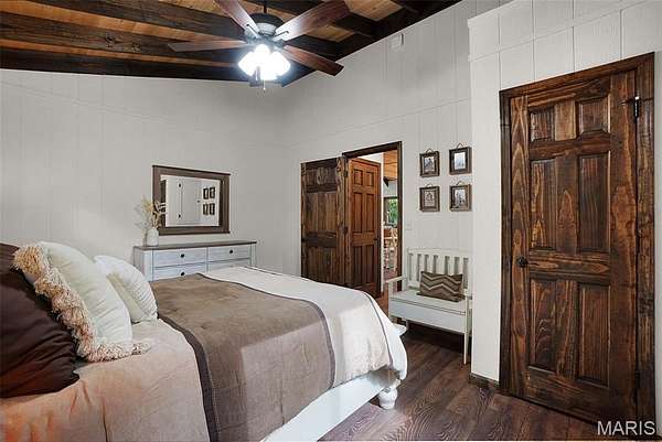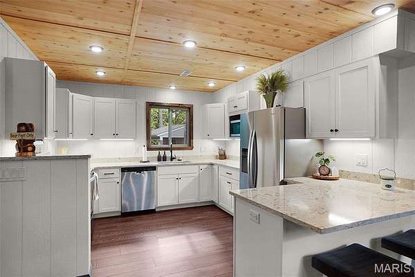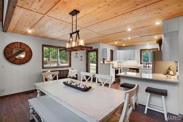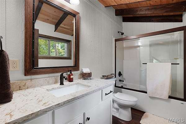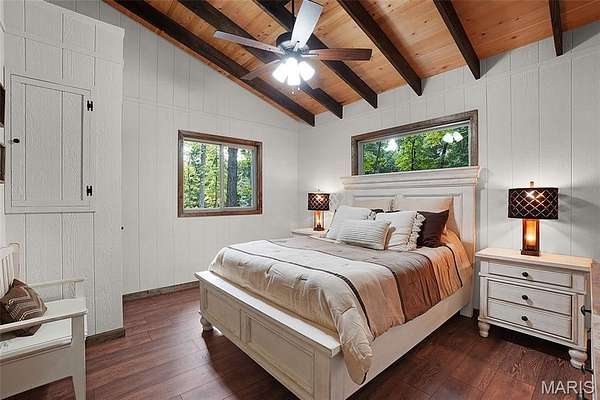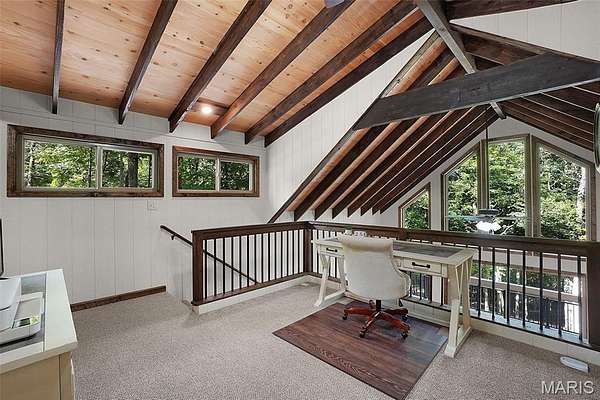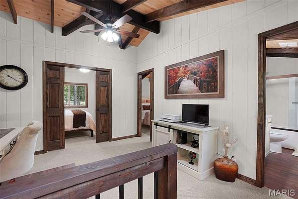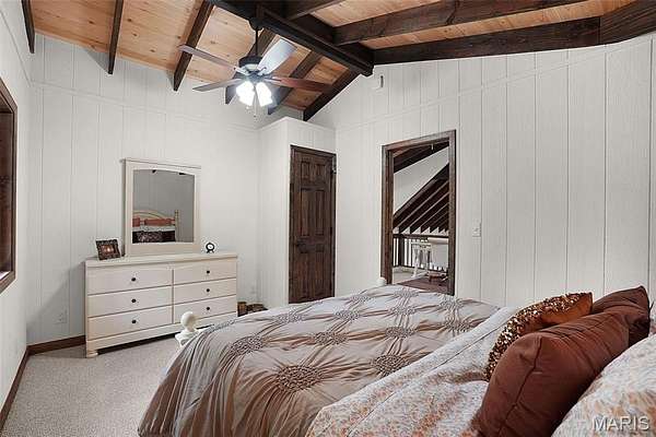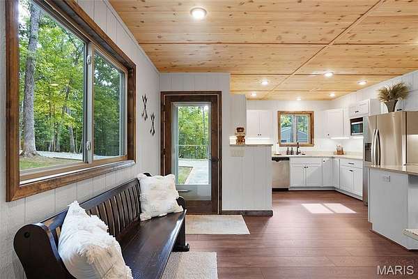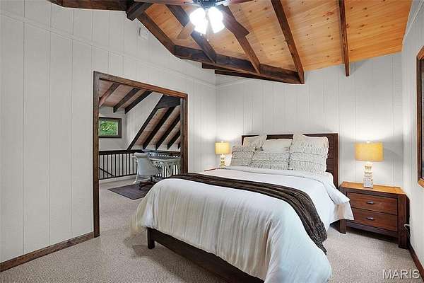 Completed in March 2025, this nearly brand-new chalet features numerous upgrades, including cedar ceilings, quartz countertops, a 12' x 36' expanded composite deck, and a stunning floor-to-ceiling stone wood-burning fireplace. A bright and inviting four-season room adds extra living space year-round. The home sits on a peaceful 2.92-acre wooded lot with just two neighboring properties on a quiet dead-end street, ensuring ultimate privacy. Inside, you'll find straightened walls (no A-frame), a warm and cohesive color palette, and stylish finishes such as metal spindles and baseboards throughout. The professionally landscaped grounds include a fire pit area, stone walkways, and a covered front porch, perfect for outdoor entertaining. The insulated shed features a finished interior and overhead garage door with opener. All new Whirlpool appliances (refrigerator, stove, dishwasher, washer, and dryer) plus a GE microwave/air fryer are included. Just 1/4 mile from Alpine Lake's boat ramp, this home offers access to Innsbrook's exceptional amenities, including over 100 lakes, an 18-hole golf course, hiking trails, fishing, kayaking, tennis courts, a lazy river pool, and more. Whether you're looking for a peaceful retreat surrounded by nature or a profitable short-term rental, this property offers the perfect blend of relaxation and income potential.
