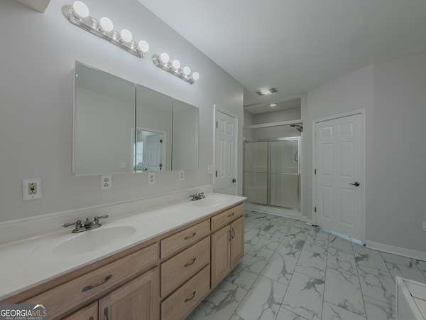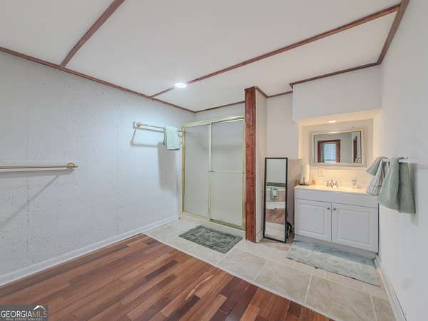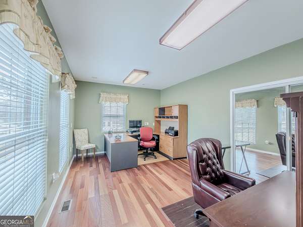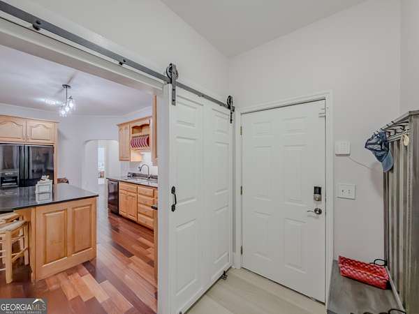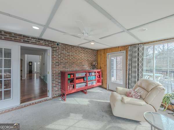 Custom, four-sides brick set on approximately 1.66 acres, pairing everyday convenience with outdoor breathing room. An oversized primary suite sits on the main level; French doors open to a private deck for morning coffee or quiet evenings. The en-suite bath offers new flooring, dual vanities, an oversized soaking tub, and a separate shower. Brazilian cherry hardwoods warm the main level, which also includes a light-filled sunroom. The kitchen features rich wood cabinetry, a center island, and granite countertops. A whole-home interior refresh in neutral tones complements new upstairs carpet and new bath flooring. Upstairs, three oversized bedrooms with walk-in closets and two full baths deliver flexible space; laundry rooms on both the main and upper levels add convenience. The terrace level provides about 1,000 square feet of finished flex space for media, recreation, office, or fitness, plus storage. Outside, enjoy established peach trees, fig and blueberry bushes, a strawberry bed, and a stream near the back of the property; local wildlife is often observed. Three-car garage. Major updates include roof (2020), new water heater, and replacement of the exterior furnace and the basement furnace. Sale includes adjacent parcel 8016 Union Grove Rd, Lithonia (Tax ID 16 218 01 008), bringing the total to roughly 1.66 acres. Rockdale Magnet School for Science and Technology may be an option by application; buyer to verify eligibility and requirements. Square footage and acreage are approximate and should be verified by buyer.