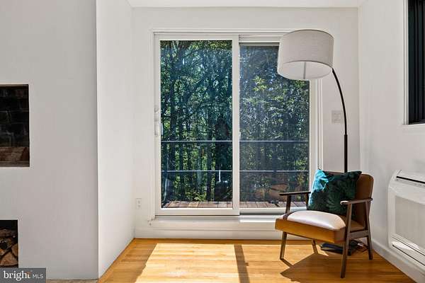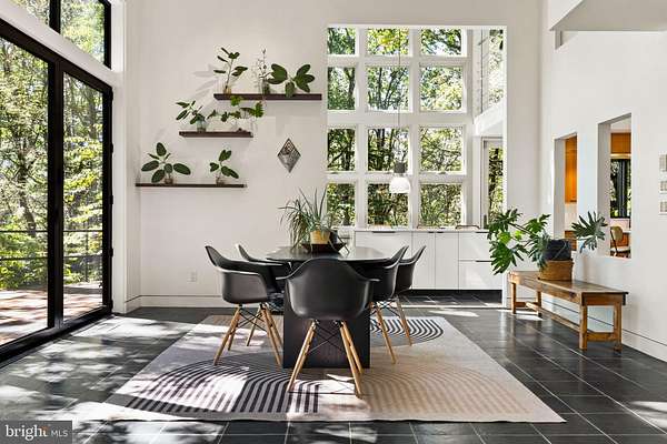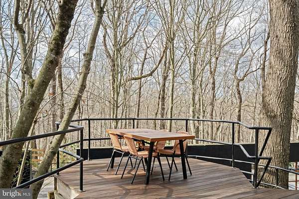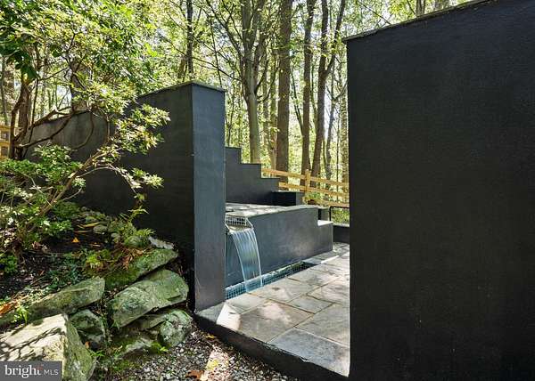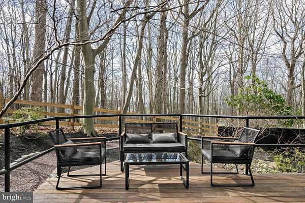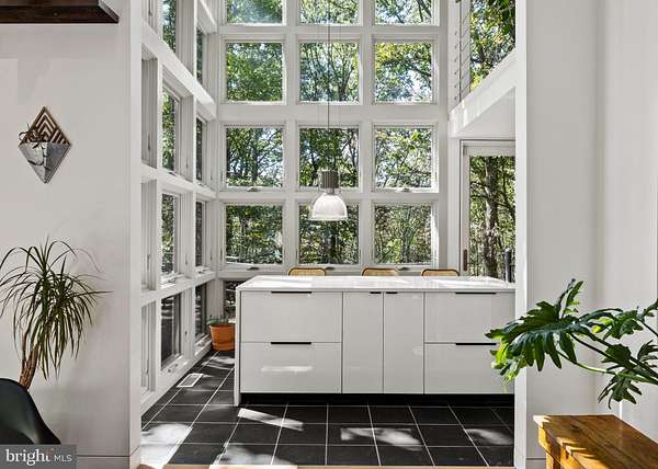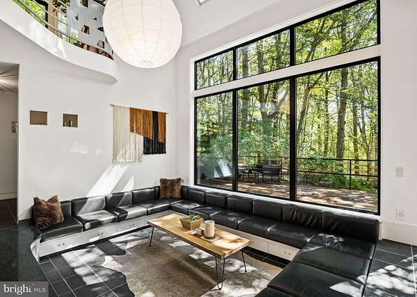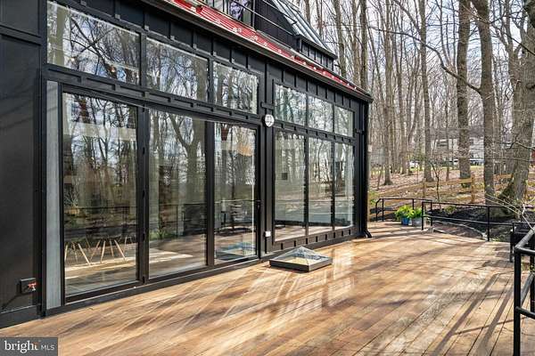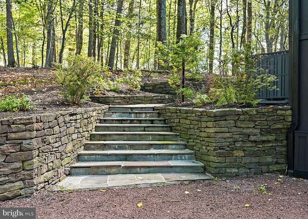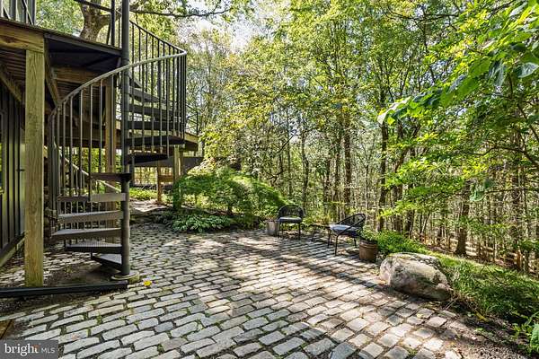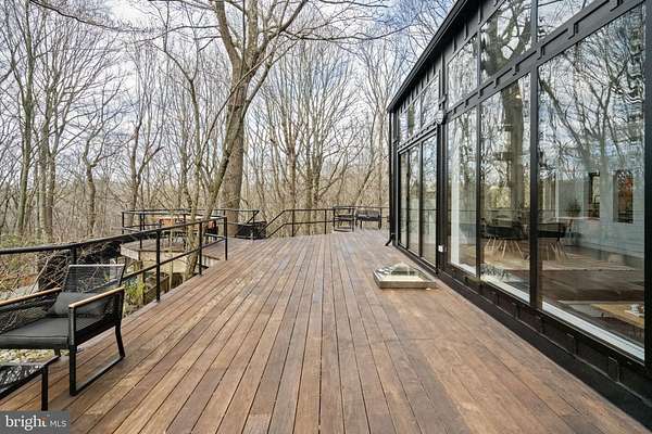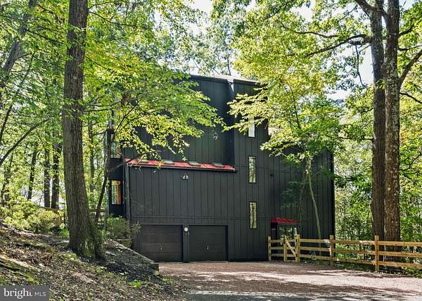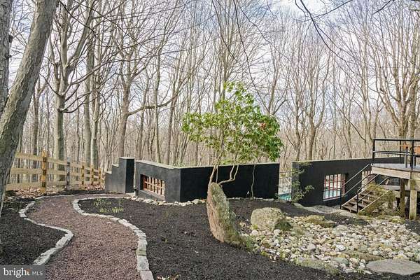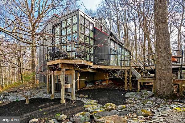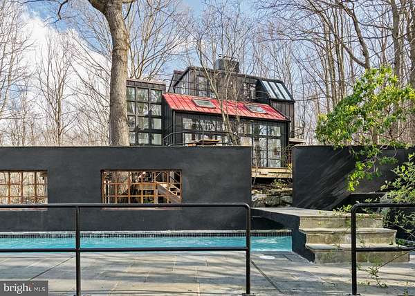 Breathtaking architecture on three wooded acres provides a residence as equally well-suited for entertaining as it is for tranquil everyday living in this Bucks County treasure. The Scandinavian influence is evident in the full walls of glass and dramatic windows that bring the outside in, a central chimney that provides a fireplace on every floor, and the use of natural materials including slate and oak floors. Lovely custom details with a touch of whimsy grace the interior, and the current owners have made extensive improvements. The main floor offers a spacious foyer entrance, library with skylight, powder room and sitting room all on one side of a double fireplace with newly installed woodstove insert. On the other side is the showstopping open living and dining space with vaulted ceilings, floor-to-ceiling windows, custom conversation pit with integrated storage that seats a crowd, and a just-installed wall of custom 12-foot glass bifold doors that allow the separation between the inside and the expansive Ipe wood deck with multiple entertaining areas to all but disappear. The corner breakfast room has two walls of floor-to-double-story-ceiling windows, from which the current owners eliminated a wall and added a breakfast bar to make it more open to the kitchen, where the Scandinavian design principles really come to life. Functional details like a prep sink, pot filler and wine fridge are integrated into the understated warmth and luxury of oak flat-front cabinets alongside fresh quartz countertops and glazed ceramic tile backsplash. The second story has a large central sitting room with fireplace overlooking the living room with a newly renovated terrazzo tile bathroom, two bedrooms, and an office with French doors to a balcony. The third floor is the peaceful primary suite, with a fireplace and sliders to a balcony that spans the entire side of the house and overlooks the wooded hillside and pool area. Soak among the treetops in the gorgeously remodeled en suite, where the tub sits beneath a span of oversized sloped windows, or enjoy the same view from the curbless shower with fluted marble surround. The delightful walkout lower level has a wet bar, a large den with oversized French doors to a cobblestone patio, a guest suite with a newly renovated bathroom, and access to the laundry room. Just as stunning as the home itself is the newly plastered pool and spa with flagstone pavers, which are framed by a decorative wall on one side and an expanse of woods on the other. Other exterior upgrades include new elegant black Hardie board and batten siding and a fence encompassing a large area of the yard and pool. In a bucolic Bucks County setting and down a private road, the home is away-from-it-all yet a short drive to Doylestown, New Hope, and Lambertville, making it both a desirable year-round residence and an attractive getaway for Philadelphians and New Yorkers alike.