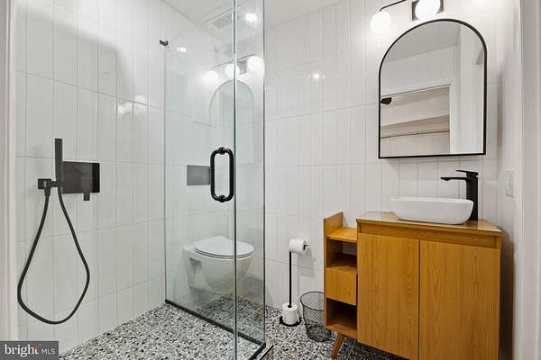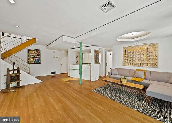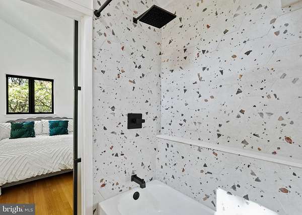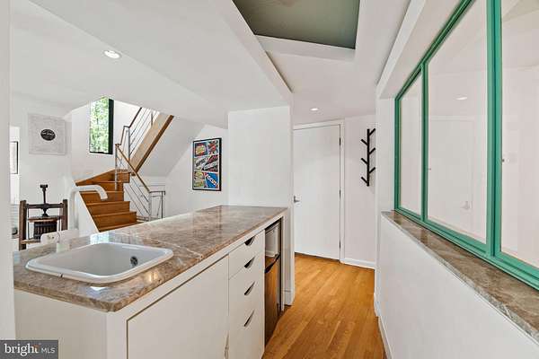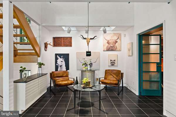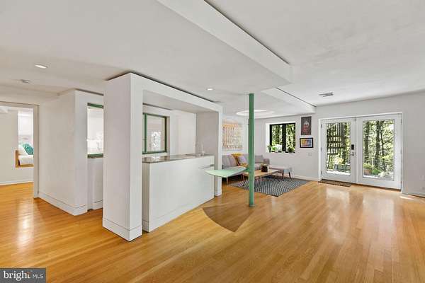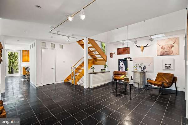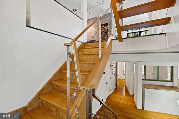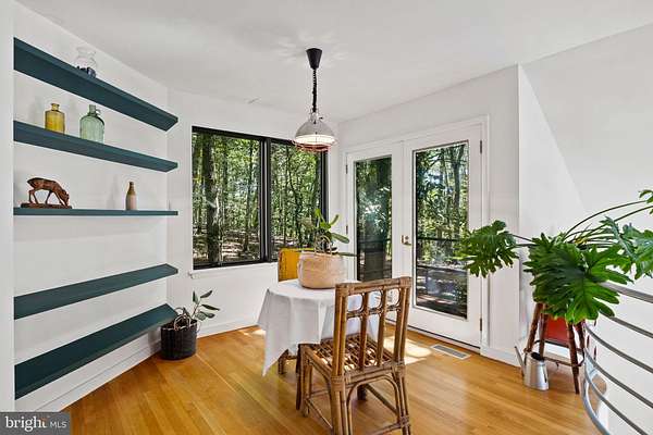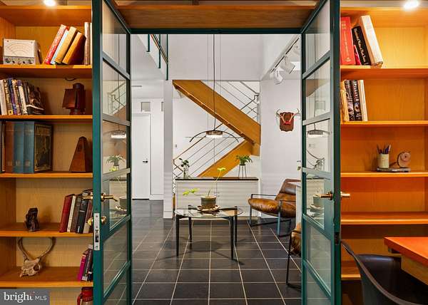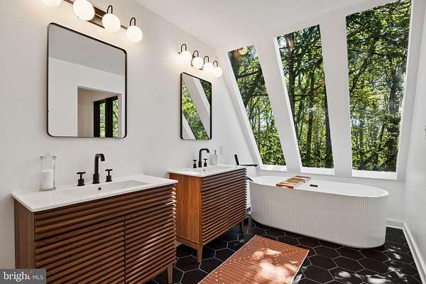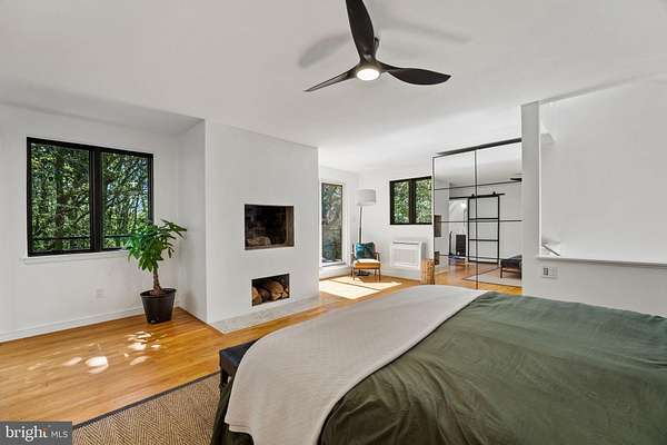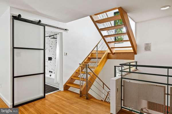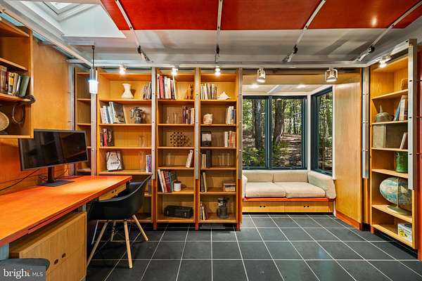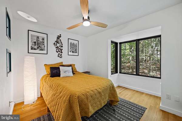 Breathtaking architecture on three wooded acres provides a residence as equally well-suited for entertaining as it is for tranquil everyday living in this Bucks County treasure. The Scandinavian influence is evident in the full walls of glass and dramatic windows that bring the outside in, a central chimney that provides a fireplace on every floor, and the use of natural materials including slate and oak floors. Lovely custom details with a touch of whimsy grace the interior, and the current owners have made extensive improvements. The main floor offers a spacious foyer entrance, library with skylight, powder room and sitting room all on one side of a double fireplace with newly installed woodstove insert. On the other side is the showstopping open living and dining space with vaulted ceilings, floor-to-ceiling windows, custom conversation pit with integrated storage that seats a crowd, and a just-installed wall of custom 12-foot glass bifold doors that allow the separation between the inside and the expansive Ipe wood deck with multiple entertaining areas to all but disappear. The corner breakfast room has two walls of floor-to-double-story-ceiling windows, from which the current owners eliminated a wall and added a breakfast bar to make it more open to the kitchen, where the Scandinavian design principles really come to life. Functional details like a prep sink, pot filler and wine fridge are integrated into the understated warmth and luxury of oak flat-front cabinets alongside fresh quartz countertops and glazed ceramic tile backsplash. The second story has a large central sitting room with fireplace overlooking the living room with a newly renovated terrazzo tile bathroom, two bedrooms, and an office with French doors to a balcony. The third floor is the peaceful primary suite, with a fireplace and sliders to a balcony that spans the entire side of the house and overlooks the wooded hillside and pool area. Soak among the treetops in the gorgeously remodeled en suite, where the tub sits beneath a span of oversized sloped windows, or enjoy the same view from the curbless shower with fluted marble surround. The delightful walkout lower level has a wet bar, a large den with oversized French doors to a cobblestone patio, a guest suite with a newly renovated bathroom, and access to the laundry room. Just as stunning as the home itself is the newly plastered pool and spa with flagstone pavers, which are framed by a decorative wall on one side and an expanse of woods on the other. Other exterior upgrades include new elegant black Hardie board and batten siding and a fence encompassing a large area of the yard and pool. In a bucolic Bucks County setting and down a private road, the home is away-from-it-all yet a short drive to Doylestown, New Hope, and Lambertville, making it both a desirable year-round residence and an attractive getaway for Philadelphians and New Yorkers alike.