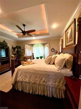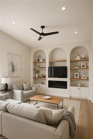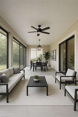 Inside, fine craftsmanship unfolds in every detail. Coffered ceilings, crown molding, and tall baseboards bring depth and refinement to open living spaces. The grand living room, complete with a custom built-in wall unit, ambient lighting, and wet bar, transitions effortlessly through glass sliders to a tiled, screened lanai. Designed for year-round enjoyment, this inviting space lives like an outdoor salon--complete with chandelier, ceiling fan, surround sound, and electric shutters for privacy and comfort.