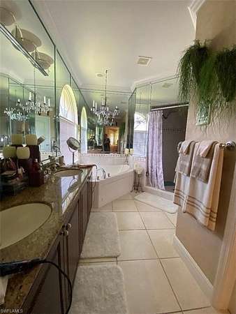 The primary suite is a retreat of warmth and tranquility, where rich wood floors and a bay window invite natural light and serenity. The adjoining spa-inspired bath is a true indulgence: a Roman soaking tub beneath a sparkling chandelier, a grand arched window, dual vanities with Moen chrome-and-gold fixtures, and an oversized walk-in shower accented by imported Spanish tile.