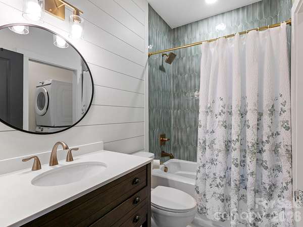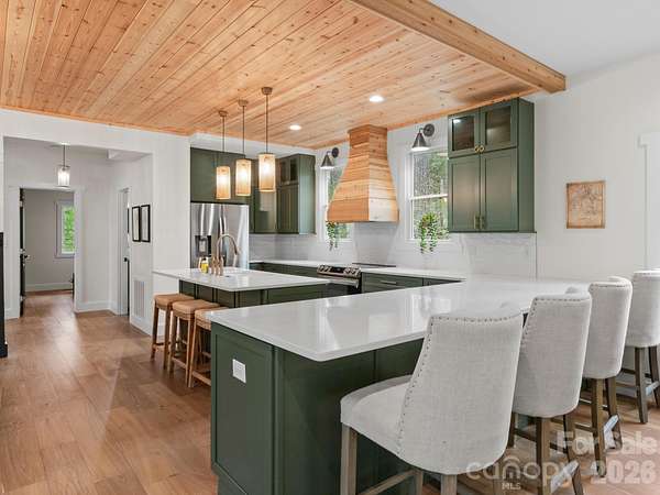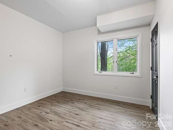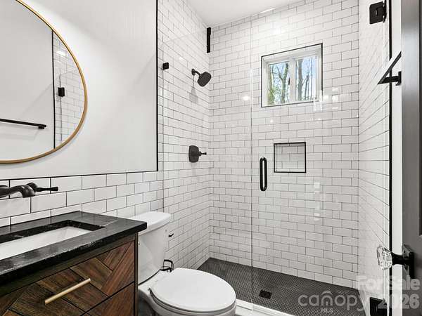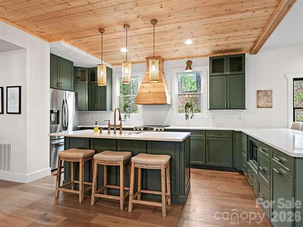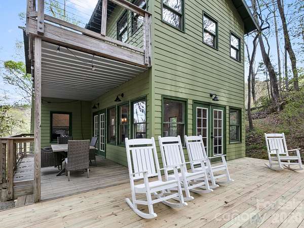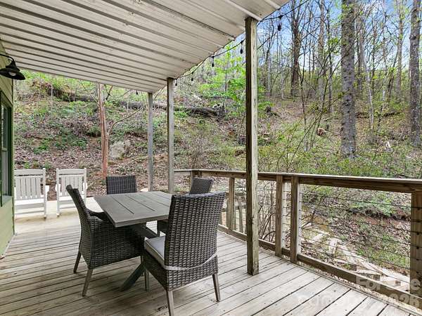 Treehouse vibes in North Asheville-tucked into the canopy for total privacy, yet just minutes from groceries and some of the area's best dining. Head the other direction and you're immersed in nature, with easy access to the Mountains-to-Sea Trail and the Blue Ridge Parkway. A special find for outdoor lovers or anyone looking to slow down and recharge. Fully refreshed in 2022, the home features thoughtful upgrades throughout: a remodeled kitchen and baths (including a third bath added upstairs), new wood and tile floors, fixtures, fresh paint, and an modern electric fireplace. Upstairs offers two primary suites and a flexible sitting area that adapts to your needs-reading nook, media room etc. The open kitchen and dining space center around an oversized breakfast bar, ideal for quiet mornings and can support hosting a crowd. The basement offers a bonus room, perfect for a home office or game room. Four decks create space with purpose-morning coffee on the upper balcony, grilling with friends on the back deck, relaxed breakfasts on the covered side porch, or simply taking in the mountain air from the front porch. Subtle chevron details add a cohesive, elevated touch throughout. Outside, a large wooded lot and a quiet stream running alongside the home complete the setting. Home sits just outside city limits.