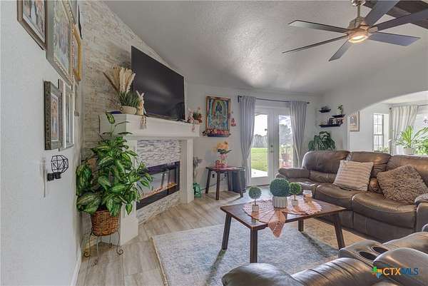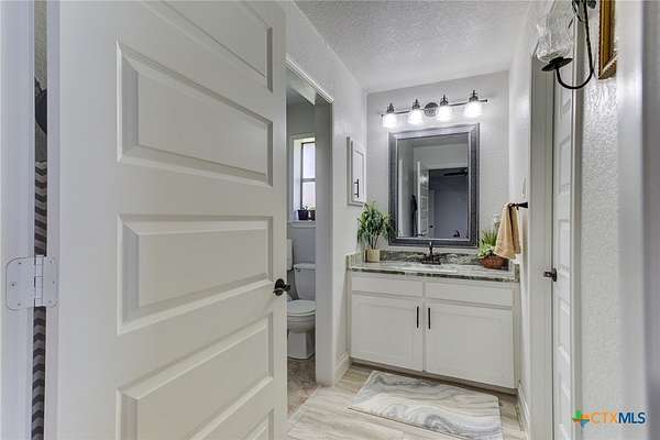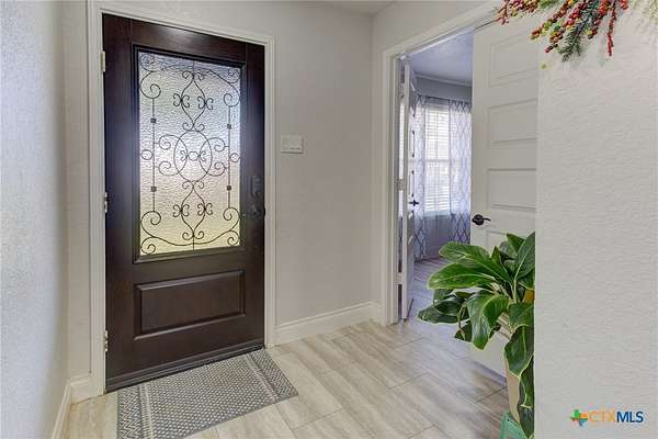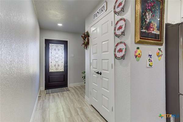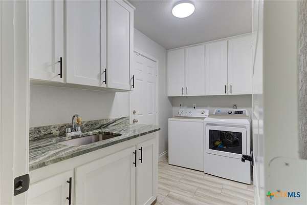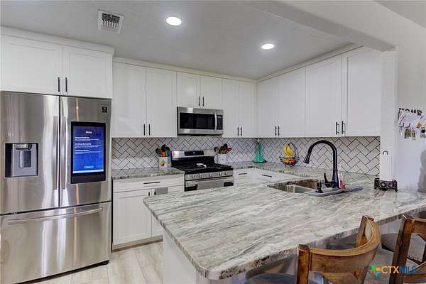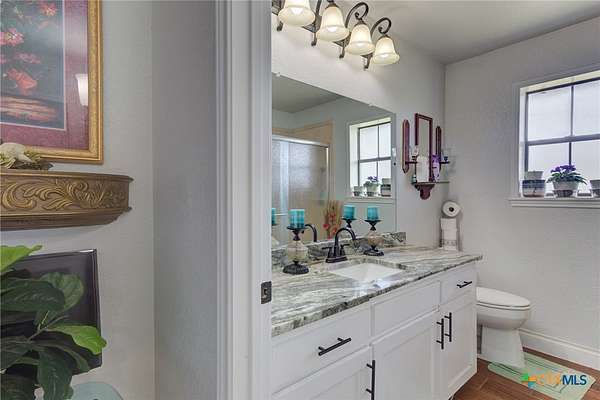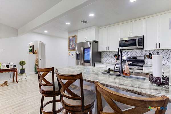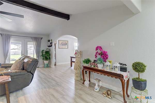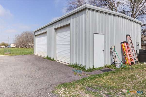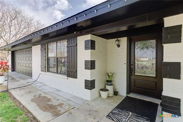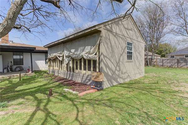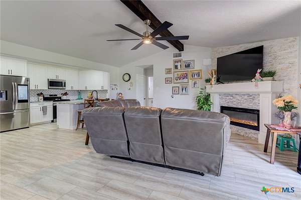 Rare find inside New Braunfels city limits! This 3-bedroom, 2-bath ranch-style home offers 1,745 SF of updated living space situated on +/-6.745 acres of level, usable land. The home features new cabinetry, granite countertops, stainless steel gas range, built-in microwave, updated lighting, modern ceiling fans, and select tile flooring. The living room showcases a vaulted ceiling with exposed beam and a fireplace with acrylic ice glass embers, opening seamlessly to the kitchen and dining area. The dining room includes a custom butler's pantry/wine bar-ideal for entertaining. The partially fenced acreage includes multiple outbuildings: a 20x40 concrete steel building with electricity, two oversized garage doors, workshop space and auto lift; an 18x20 building previously used for pets or FFA projects; and an approximately 200 SF metal storage shed. Located within city limits with city sewer and no HOA. Surrounded by established neighborhoods, this property offers privacy, flexibility, and potential for future residential use (buyer to verify). Enjoy acreage living with city conveniences in one of New Braunfels' growing areas.