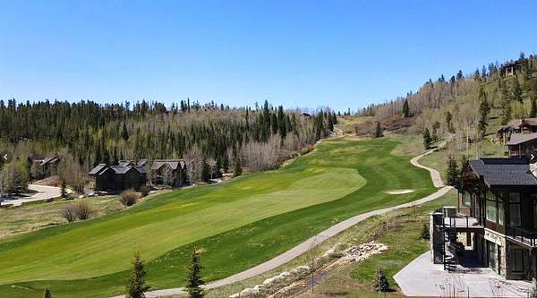 Coveted Setting: Enjoy sweeping views of the course and surrounding peaks from a rare vantage point--watch golfers start and finish the front nine from your future patio.