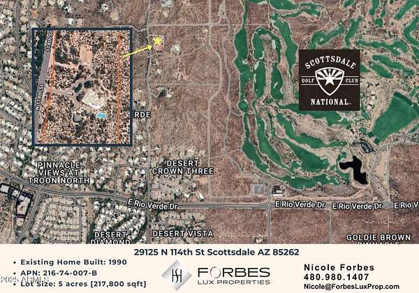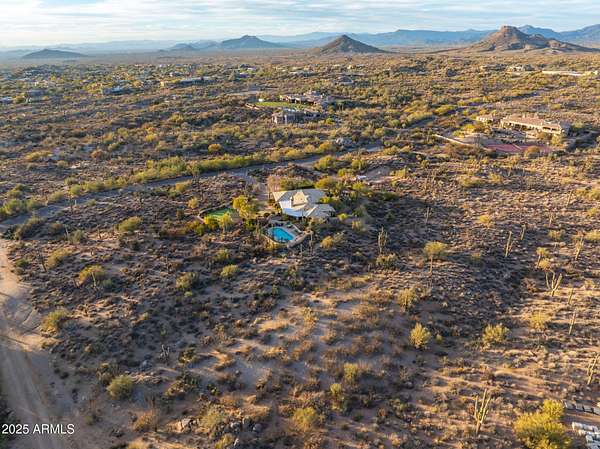 Create a Luxury Estate Masterpiece - North Scottsdale - 5 Acres w/ Endless Lifestyle Options. This rare 5-acre property boasts panoramic 360 degrees views of Pinnacle Peak, extensive city lights, & surrounding mountains. Nestled in one of the most coveted enclaves, it offers unmatched privacy while being minutes from the prestigious Scottsdale National Golf Club and premier equestrian facilities. Surrounded by multi-million-dollar estates, the property features: - Charming existing home to enjoy while designing your estate - Two elevated building sites with breathtaking vantage points - Over 50 iconic saguaros amid pristine desert landscape - Horse-friendly zoning, or enjoy nearby facilities - No HOA; opening the door for private tennis, pickleball, par three & resort-style amenities!