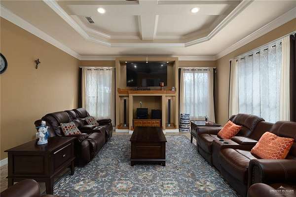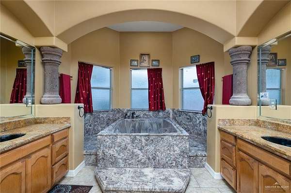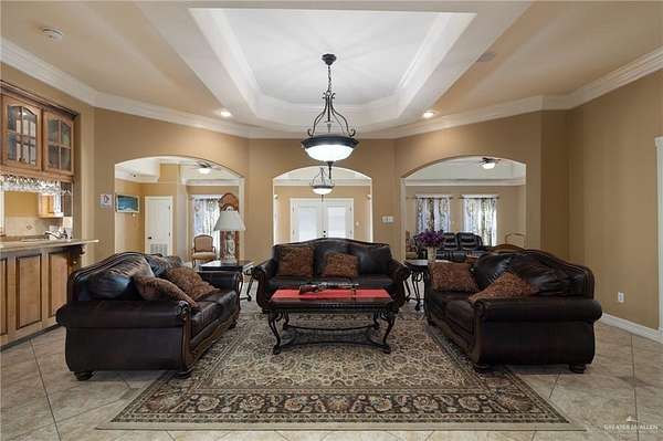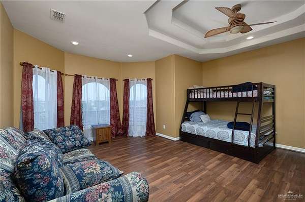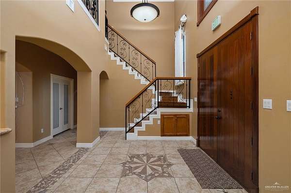 Welcome to 2914 Horizon Trail, Edinburg, Texas-a rare blend of Big Country living with modern convenience. This 7-bedroom, 4.5-bath estate offers 7,500+ sq. ft. of luxury, perfect for comfort and entertaining. The split floor plan ensures privacy, while the open-concept design connects the kitchen, family room, and formal living areas. Upstairs, 4 spacious bedrooms lead to a glorious balcony for sunset views. The kitchen and baths feature granite countertops, with wood, tile, and laminate flooring adding warmth throughout. A grand wood double-entry door sets the tone for elegance, while the 3-car side-entry garage and landscaped front yard with palm trees enhance the curb appeal. Beyond the cedar fence, native mesquite trees provide privacy and natural beauty. A true must-see esp. with price per sq ft. -schedule your private tour today!