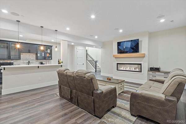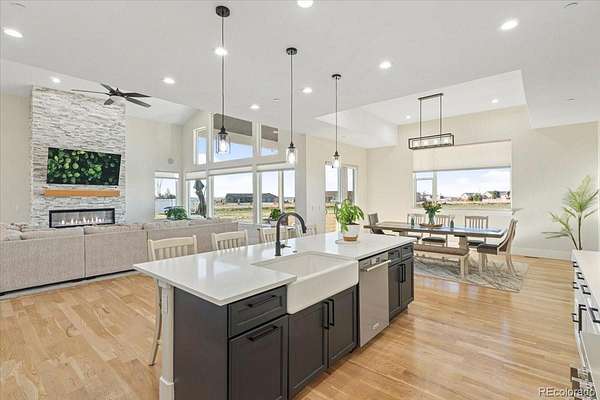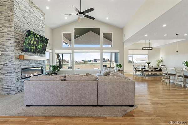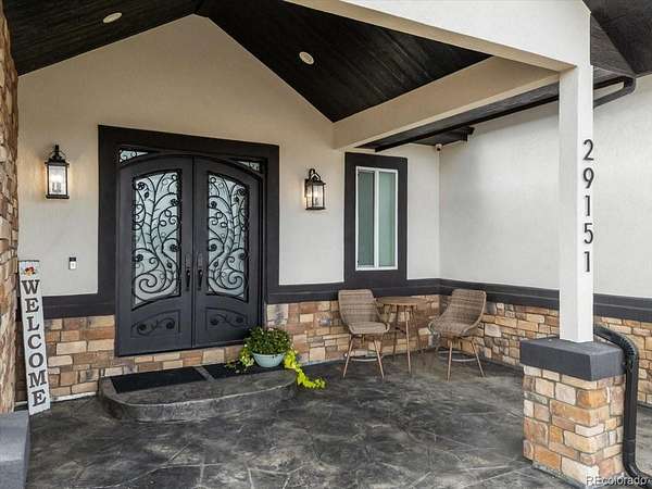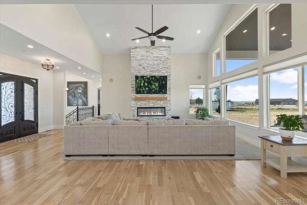 Tucked at the end of a quiet cul-de-sac on 2.28 acres with no HOA, this 6,832 sq ft custom home with a 4-car garage delivers privacy, scale, and elevated living. Recently refreshed front landscaping enhances the curb appeal and sets the tone the moment you arrive. Inside, the great room is built to impress with soaring ceilings, walls of windows, and a floor-to-ceiling fireplace that anchors the space. The kitchen is designed for both function and style, featuring a large island with seating, farmhouse sink, custom tile backsplash, walk-in pantry, and JennAir appliances, all flowing seamlessly into the dining area. The main level primary suite is a true retreat with its own fireplace, spa-style bath, dual walk-in closets, and custom vanity. Three additional bedrooms, a spacious laundry room, and mudroom complete the main floor. Downstairs, the fully finished basement expands your living options with two en suite bedrooms ideal for guests, office, or creative space, plus a theater room, workout area, and an open rec and game space with wet bar and ample storage. Surround sound is already wired throughout key living areas and outdoor patio. Thoughtful upgrades include a camera security system, fire suppression system, tankless water heater, and dual A/C units. Outdoor living is where this property really opens up. Enjoy the covered front porch, expansive back patio, and wide spacing between homes that gives you privacy and uninterrupted sky. Horses are allowed, with plenty of room for RV parking, toys, future outbuildings, or whatever vision you bring.