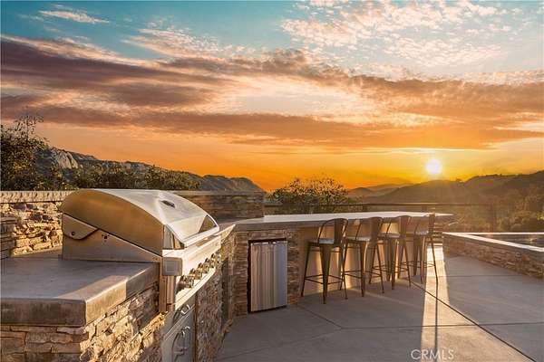 Outdoor living is exceptional with a custom deck surrounding the infinity pool and spa, an Alumawood-covered patio, built-in BBQ, two blue bowl fire pits, outdoor refrigerator, and expansive entertaining spaces ideal for enjoying unforgettable sunsets.