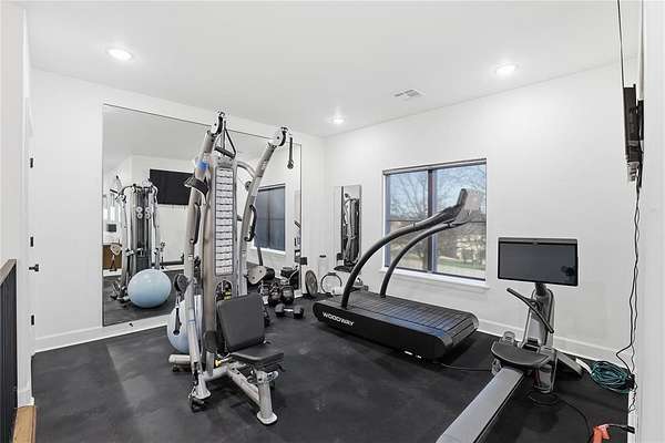 The private office offers refined functionality and warmth with pocket doors, wood flooring, and a cozy gas-log fireplace. The primary suite serves as a serene sanctuary, featuring dual vanities with custom lit cabinetry, a deep soaking tub, and a spectacular glass-enclosed walk-in shower with rainfall and multi-head fixtures. The boutique-style closet showcases illuminated glass-front cabinetry and exceptional organization. Upstairs, a spacious bonus room provides flexible living options--perfect for a media room, gym, or guest retreat--accompanied by an additional bedroom, full bath, and powder bath.