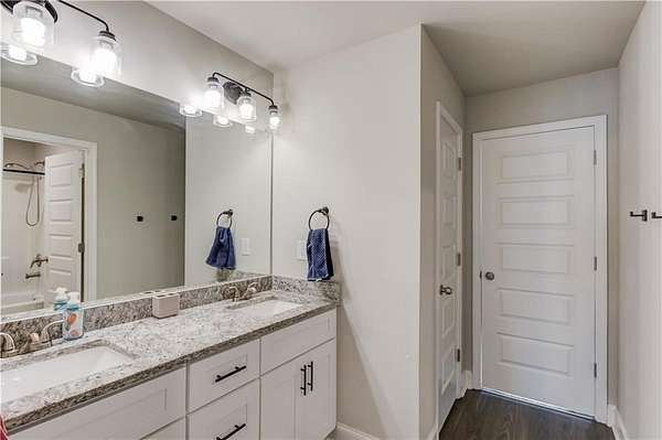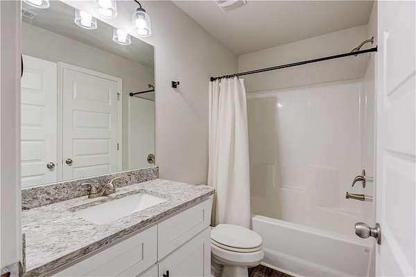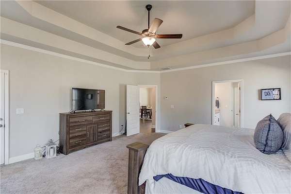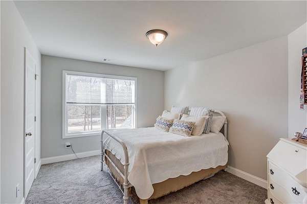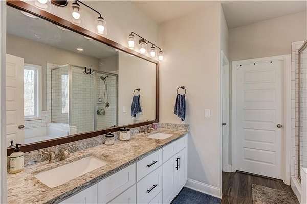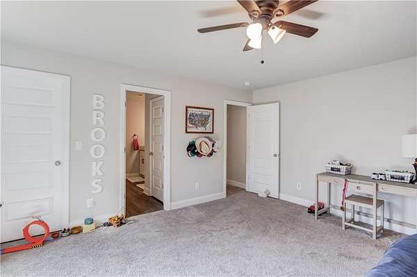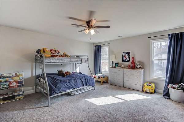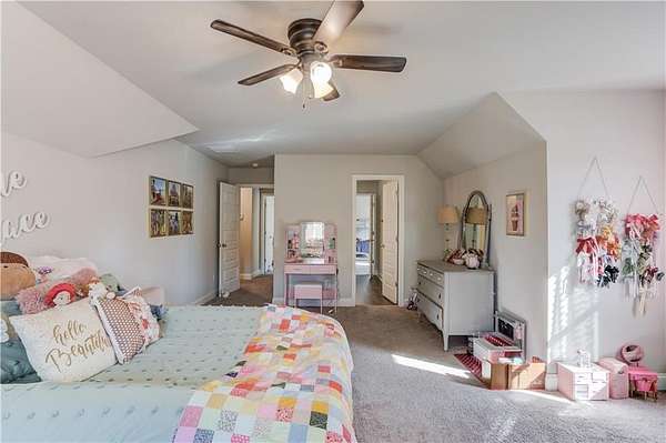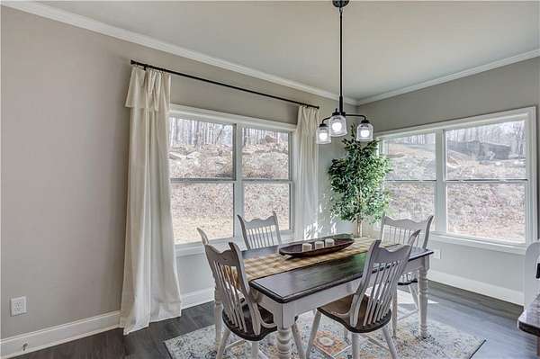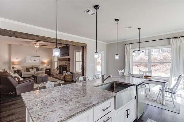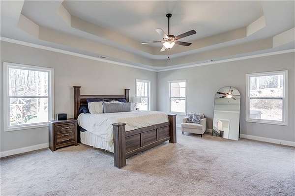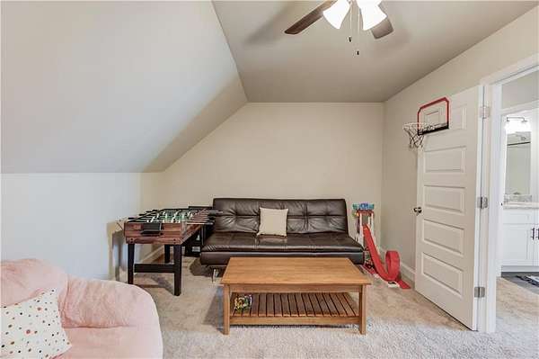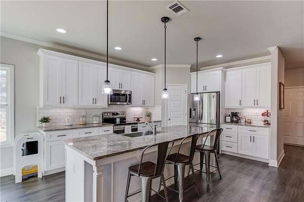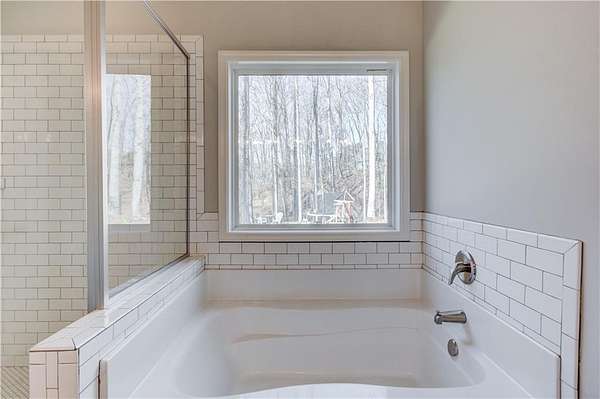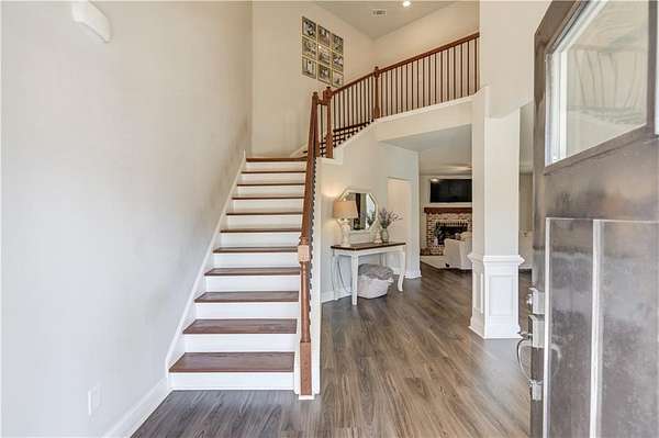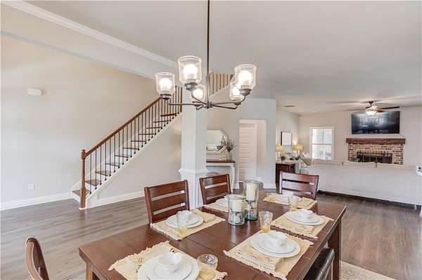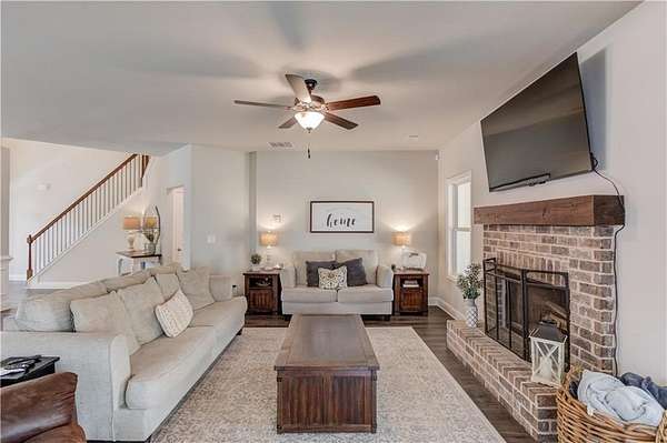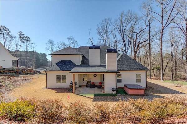 Welcome to this beautiful 4BDRM, 3.5BATH home tucked away on a private, over-2-acre wooded lot with a long driveway, decorative front fencing, and no HOA! A covered front porch with a swing sets the tone right away that is perfect for slow mornings with coffee and peaceful views of the surrounding nature. Step inside to a spacious two-story foyer that opens to a formal dining room flowing seamlessly into the living space, filled with natural light, highlighted by a large cedar-style decorative beam and centered around a cozy fireplace. The open concept kitchen is a true standout, featuring white cabinetry, stone countertops, stainless steel appliances, a large island with breakfast bar, pantry, and an eat-in kitchen area that is ideal for everyday living and entertaining. The highly desirable primary suite on the main level is generously sized and features a spa like bathroom with double vanity, oversized soaking tub, and a glass-framed separate shower. The main level also includes a mudroom and expanded laundry room with sink and side entry, adding everyday functionality. Upstairs, you'll find spacious bedrooms, a large bonus/rec/media room, and thoughtful details throughout. Additional features include a two-car garage with smart opener, lofted outdoor storage shed, underground gutter and drainage system, bike trails around the property, and beautiful landscaping with azaleas that bloom in both spring and fall. From the kitchen, step outside to the covered back patio, complete with an outdoor TV setup and brick fireplace, an absolute dream space for hosting or relaxing year round. The backyard offers endless possibilities with a tiered putting green, turf play area, playground space, and a large concrete pad perfect for pickleball, basketball, or a fire pit. A private hot tub surrounded by artificial turf completes this incredible outdoor retreat. This home truly offers the perfect blend of privacy, comfort, and outdoor living.