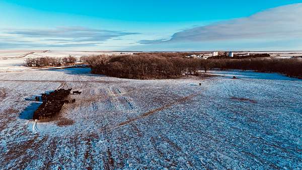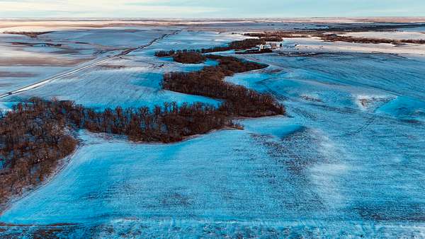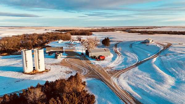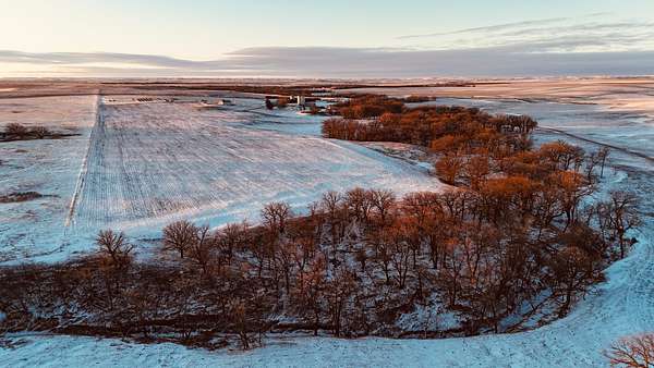 This 640+- acres in Mellette County is mostly productive farm ground, with pasture and creek bottoms mixed in. The farmstead includes a one-story main home with basement space, a smaller second house, a shop, grain bin, and two sheds. Oak Creek and Whitehorse Creek run through the property, adding water, cover, and a break from the open fields.