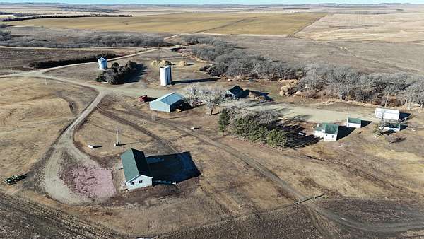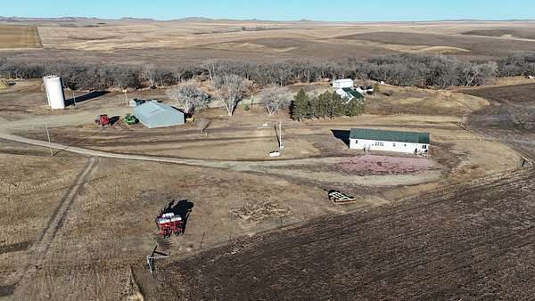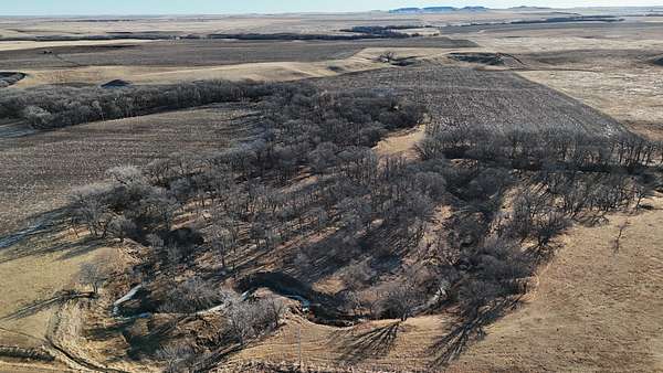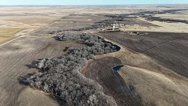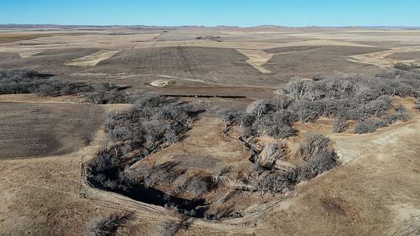 This 640± acres in Mellette County is mostly productive farm ground, with pasture and creek bottoms mixed in. The farmstead includes a one-story main home with basement space, a smaller second house, a shop, grain bin, and two sheds. Oak Creek and Whitehorse Creek run through the property, adding water, cover, and a break from the open fields.