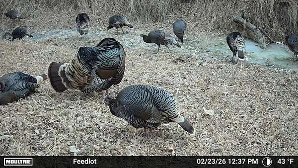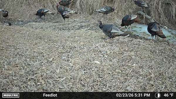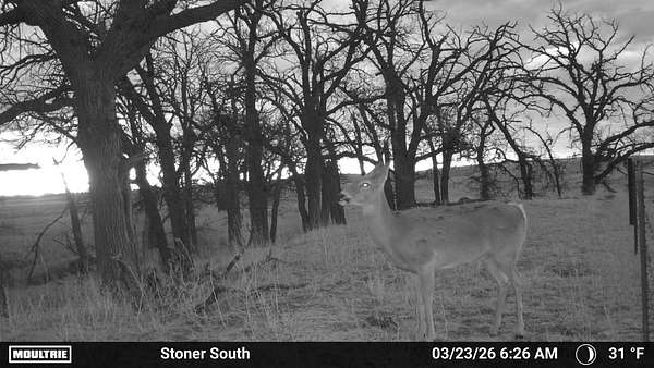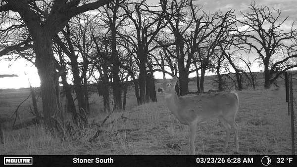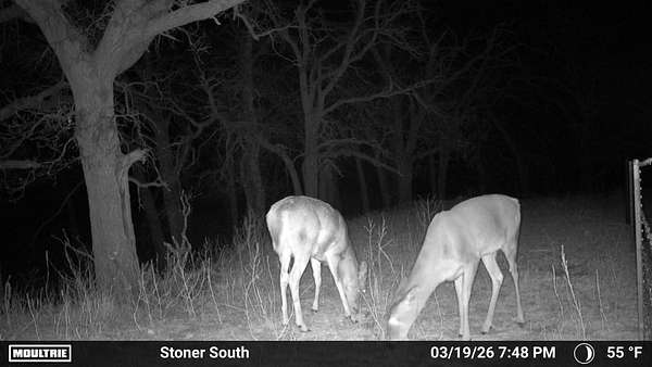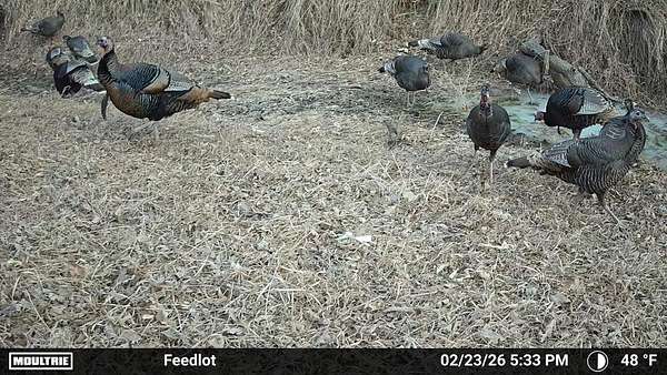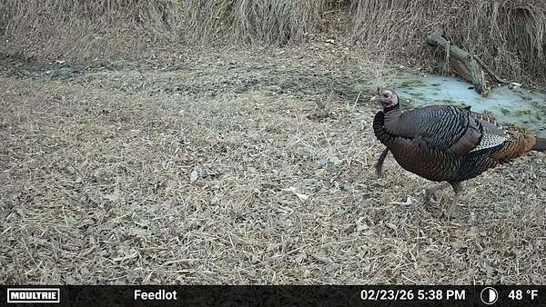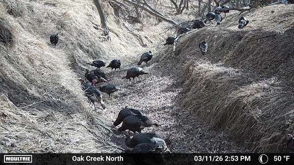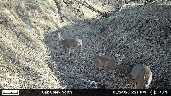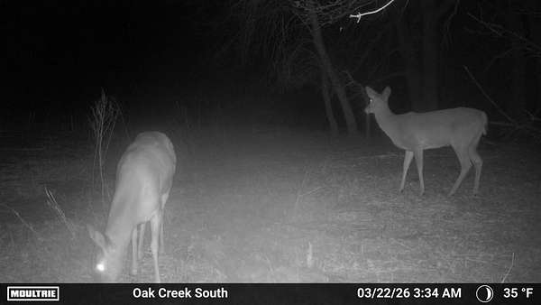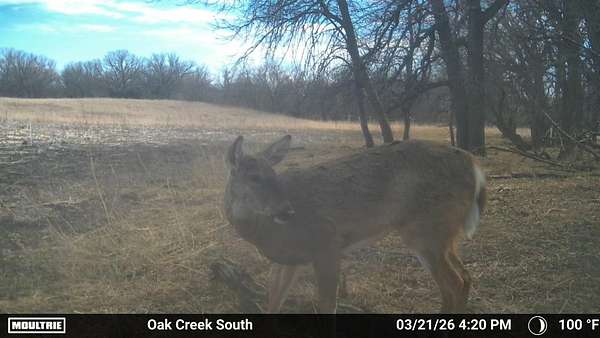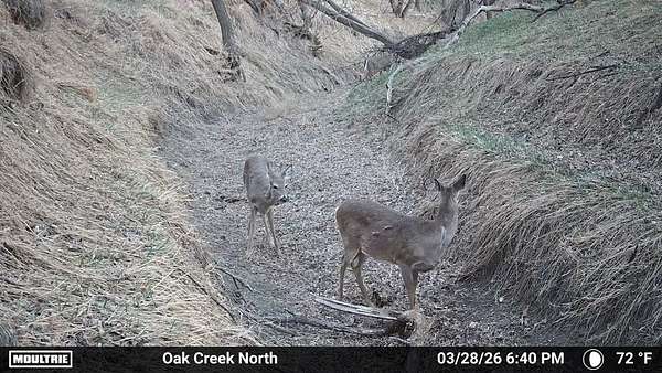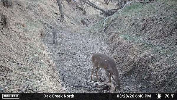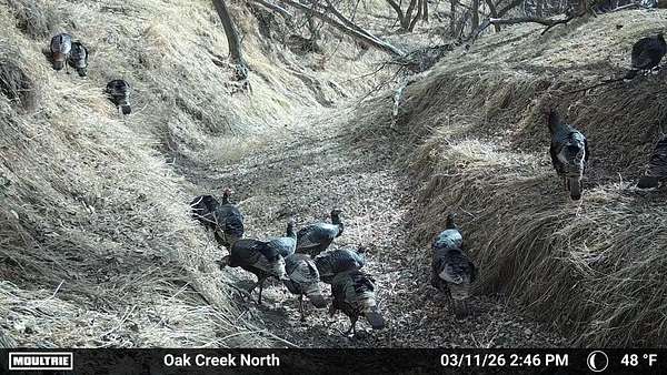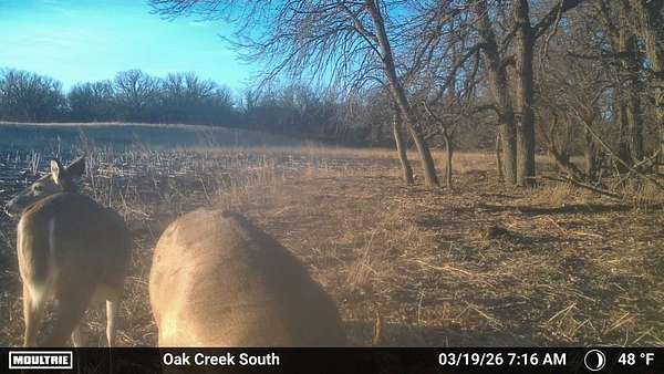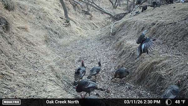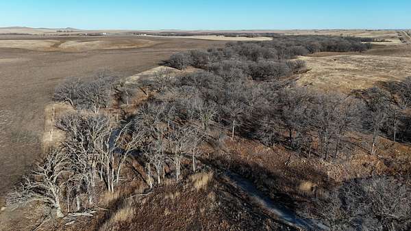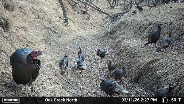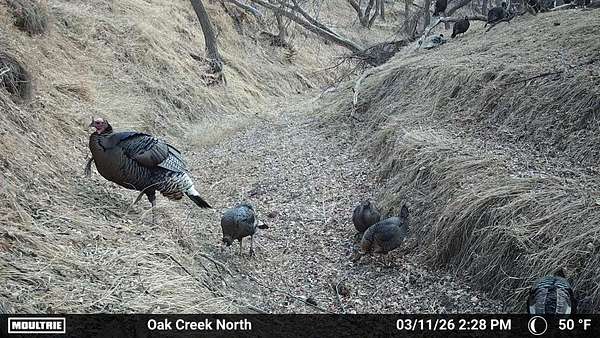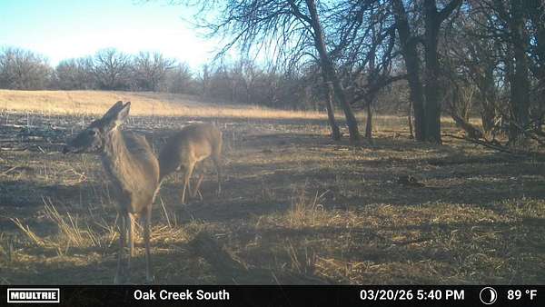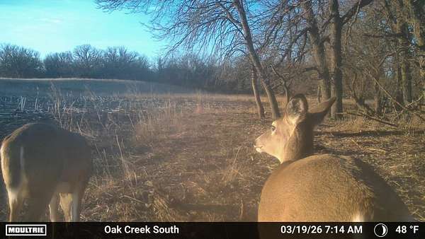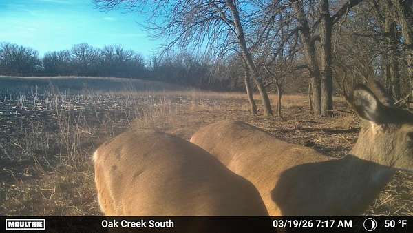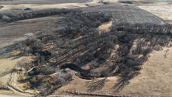 Beyond the ag value, this place has a lot to offer for hunting and wildlife. With Oak Creek and Whitehorse Creek running through the property, you’ve got natural travel corridors, cover, and water that pull wildlife in and keep it there. The turkey numbers are impressive—around 200 birds were seen along the creek—and there are deer scrapes throughout the farm, including one on a tree right between the two houses. Pheasants are common, and trail cameras picked up bobcats within the first night, which says a lot about the habitat and how lightly pressured the area can be.